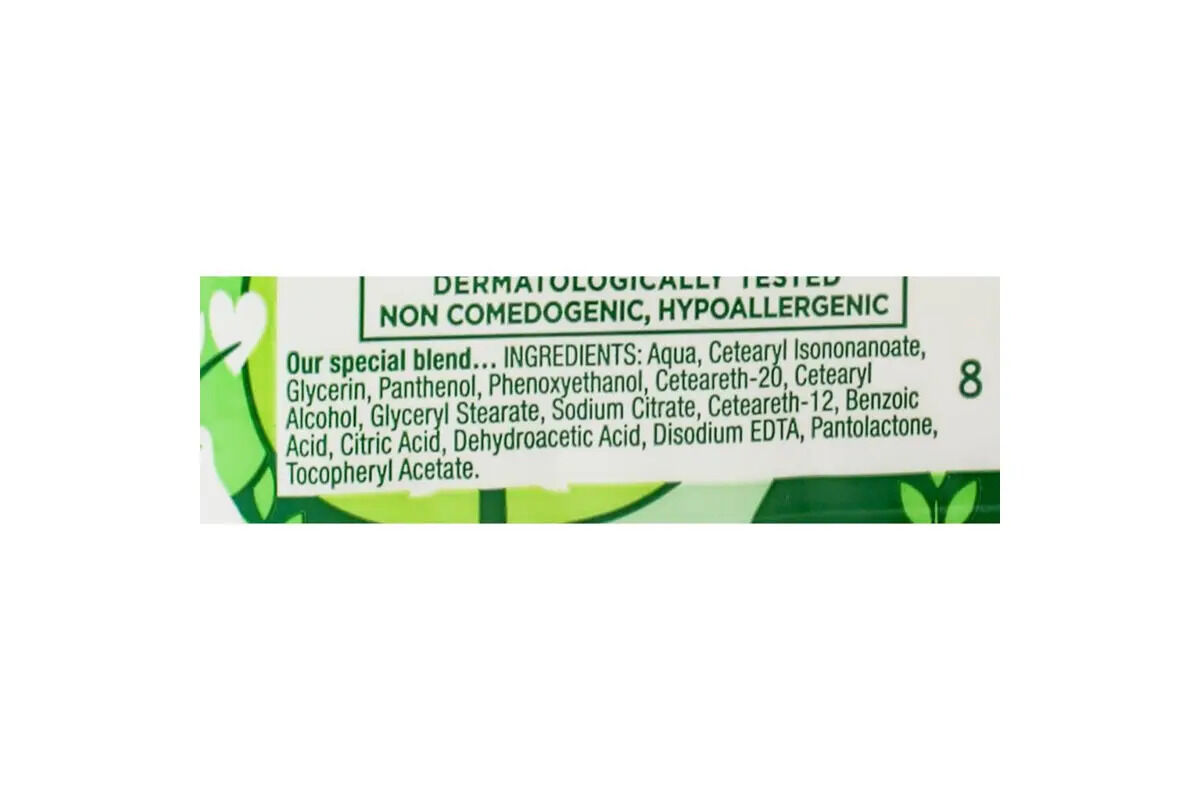 Ingredients:Aqua, Ceyearyl Isononanoate, Glycerin, Panthenol, Phenoxyethanol, Ceteareth-20, Cetearyl Alcohol, Glyceryl Stearate, Sodium Citrate, Ceteareth-12, Benzoic Acid, Citric Acid, Dehyroacetic Acid, DisodiumEDTA, Pantolactone, Tocopheryl Acetate.