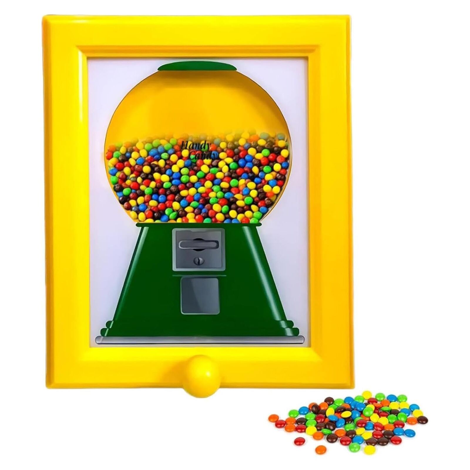 This rare vintage-style candy dispenser combines a frame design with a classic gumball-machine structure, ideal for home decor and fun interactive treats.Unique Creative Frame DesignBlends a candy machine with a decorative frame—serves as both a functional candy dispenser and a stylish wall/table decor piece, adding whimsy to any space.Fun Interactive ExperienceTurn the side handle to randomly dispense candies (like a surprise box), making it a playful addition to gatherings or daily treats.Versatile Home DecorFits various rooms (living rooms, bedrooms, game rooms) to enhance style while providing a convenient way to serve guests.Perfect Gift ChoiceGreat for birthdays, holidays, or gifting to friends—combining nostalgia, decor, and interactivity in one item.Material: Durable plasticColor: Yellow (frame) + green (candy machine)Size: 21×30×2cm (8.27×11.81×0.78in)