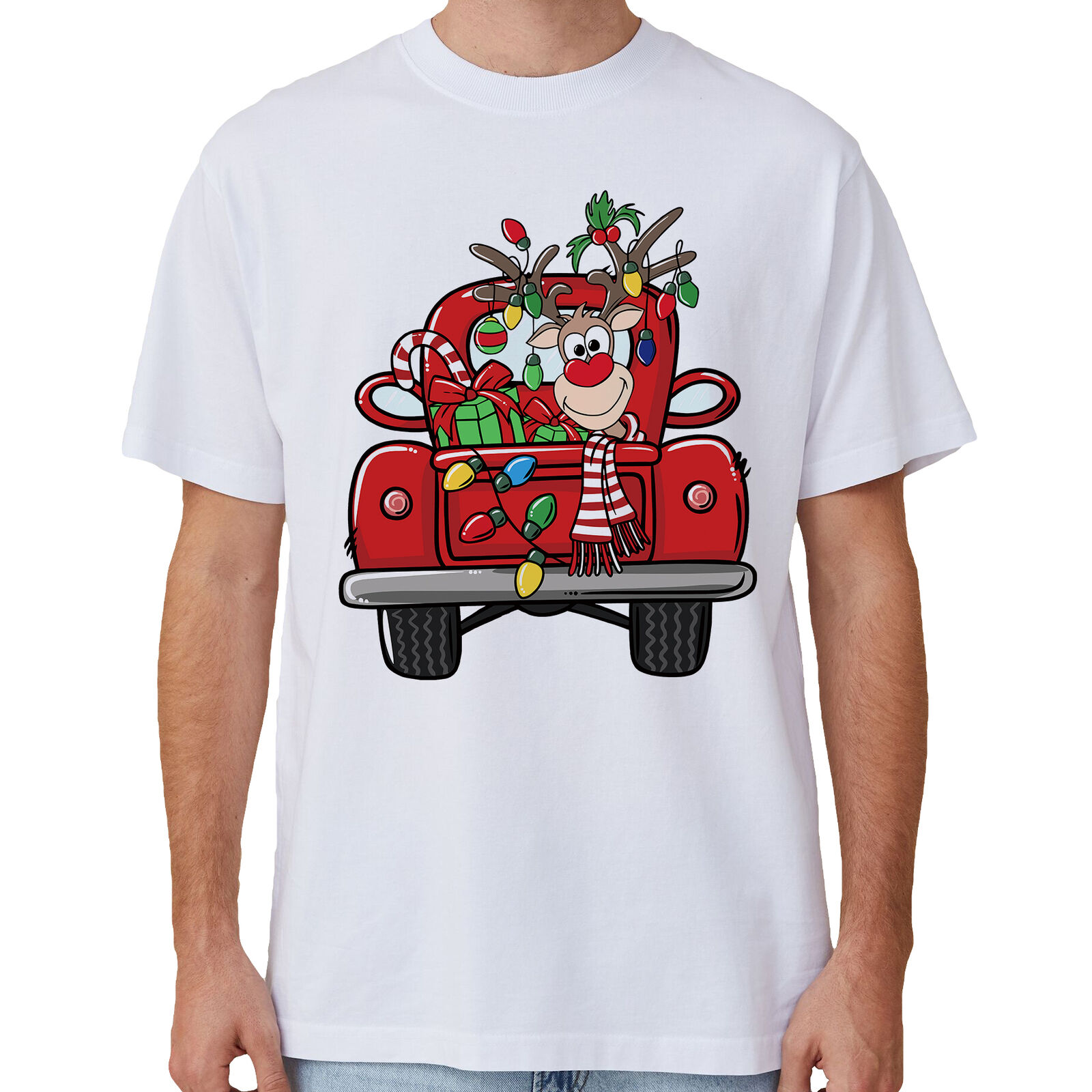 100% Cotton Christmas T-shirt Adult Unisex Tee Tops Funny Santa Party Custume, Car with Reindeer (White)