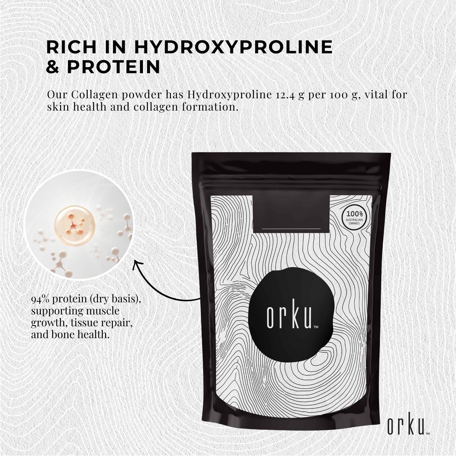 Orku Bovine Collagen Hydrolysate is a bioactive peptide protein that supports the body's own collagen found in bones, joints, skin, hair, and nails.