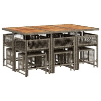 This garden dining set is a great choice for al fresco dining or just relaxing in the garden, backyard, or on the patio. Durable material: PE rattan, also known as poly rattan, is a strong, low-maintenance synthetic material that looks like natural rattan. It's lightweight, easy to clean, and commonly used for outdoor furniture due to its durability and weather-resistant properties.Compact storage: These chairs have a flap backrest that can be folded down, making it easy to store them under the table. When folded, they neatly fit under the table, forming a space-saving cube shape. Additionally, the stools can also be stored under the chairs, further maximizing space efficiency.Comfortable seat experience: This outdoor furniture, complete with thickly padded cushions, offers a comfortable seating experience.Removable and washable cover: These seat cushions feature removable covers for easy washing and maintenance. The cushion covers have a flap at the back for easy attachment to the backrests.Stable and easy-to-clean tabletop: This garden table has an acacia wood top that is sturdy, durable, and easy to clean with a damp cloth. Good to know:To make sure your outdoor furniture stays beautiful, we recommend protecting it with a waterproof cover.