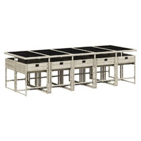 This garden dining set is a great choice for al fresco dining or just relaxing in the garden, backyard, or on the patio. Durable material: PE rattan, also known as poly rattan, is a strong, low-maintenance synthetic material that looks like natural rattan. It's lightweight, easy to clean, and commonly used for outdoor furniture due to its durability and weather-resistant properties.Compact storage: These chairs have a flap backrest that can be folded down, making it easy to store them under the table. When folded, they neatly fit under the table, forming a space-saving cube shape.Comfortable seat experience: This outdoor furniture, complete with thickly padded cushions, offers a comfortable seating experience.Removable and washable cover: These seat cushions feature removable covers for easy washing and maintenance. The cushion covers have a flap at the back for easy attachment to the backrests.Glass tabletop: The outdoor table's top is made from strong and durable tempered glass, making it easy to clean with a damp cloth and adding a touch of elegance to your outdoor space. Good to know:To make sure your outdoor furniture stays beautiful, we recommend protecting it with a waterproof cover.