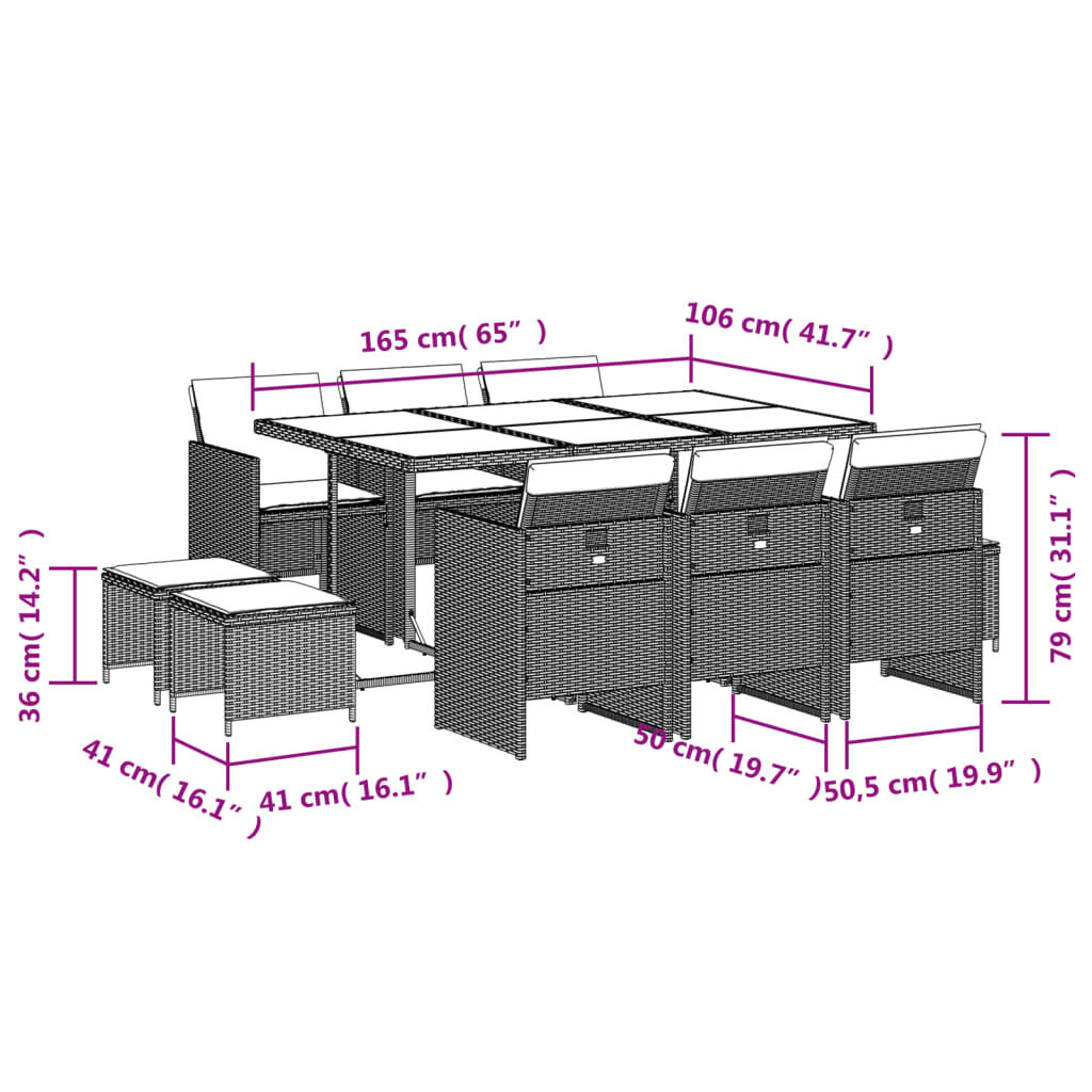 This garden dining set is a great choice for al fresco dining or just relaxing in the garden, backyard, or on the patio. Durable material: PE rattan, also known as poly rattan, is a strong, low-maintenance synthetic material that looks like natural rattan. It's lightweight, easy to clean, and commonly used for outdoor furniture due to its durability and weather-resistant properties.Compact storage: These chairs have a flap backrest that can be folded down, making it easy to store them under the table. When folded, they neatly fit under the table, forming a space-saving cube shape. Additionally, the stools can also be stored under the chairs, further maximising space efficiency. Comfortable seat experience: This outdoor furniture, complete with thickly padded cushions, offers a comfortable seating experience.Removable and washable cover: These seat cushions feature removable covers for easy washing and maintenance.Glass tabletop: The outdoor table's top is made from strong and durable tempered glass, making it easy to clean with a damp cloth and adding a touch of elegance to your outdoor space. Good to know: To make sure your outdoor furniture stays beautiful, we recommend protecting it with a waterproof cover.