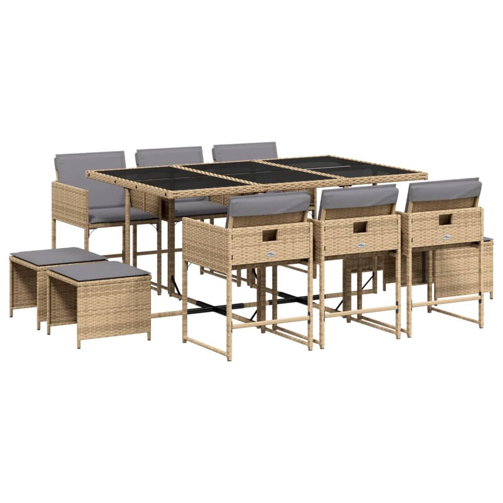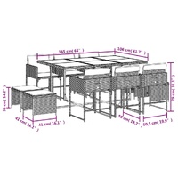 This garden dining set is a great choice for al fresco dining or just relaxing in the garden, backyard, or on the patio. Durable material: PE rattan, also known as poly rattan, is a strong, low-maintenance synthetic material that looks like natural rattan. It's lightweight, easy to clean, and commonly used for outdoor furniture due to its durability and weather-resistant properties.Compact storage: These chairs have a flap backrest that can be folded down, making it easy to store them under the table. When folded, they neatly fit under the table, forming a space-saving cube shape. Additionally, the stools can also be stored under the chairs, further maximising space efficiency.Comfortable seat experience: This outdoor furniture, complete with thickly padded cushions, offers a comfortable seating experience.Removable and washable cover: These seat cushions feature removable covers for easy washing and maintenance. The cushion covers have a flap at the back for easy attachment to the backrests.Glass tabletop: The outdoor table's top is made from strong and durable tempered glass, making it easy to clean with a damp cloth and adding a touch of elegance to your outdoor space. Good to know: To make sure your outdoor furniture stays beautiful, we recommend protecting it with a waterproof cover.