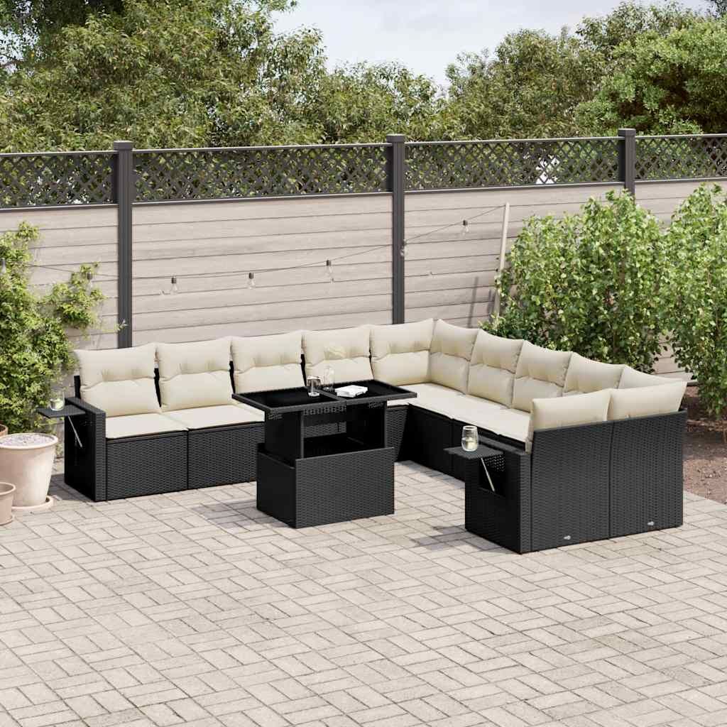 $983.23This garden sofa set is the perfect addition to your backyard, terrace, or patio, providing a comfortable and inviting space for chatting with family and friends or simply relaxing and enjoying the outdoors. Durable material: PE rattan, also known as poly rattan, is a strong, low-maintenance synthetic material that looks like natural rattan. It's lightweight, easy to clean, and commonly used for outdoor furniture due to its durability and weather-resistant properties.Adjustable tabletop: The tabletop can be lifted to make the table higher, which transforms the outdoor table from a coffee table to a dining table. It's perfect for having guests over or eating meals outside.Convenient side table: This outdoor furniture features foldable side tables with a gas spring on the armrests, providing convenient spots to keep your essentials within easy reach. Comfortable seat experience: This outdoor furniture, complete with thickly padded cushions, offers a comfortable seating experience.Modular design: This outdoor furniture set has a modular design, making it completely flexible and easy to move around, so you can create a customised outdoor furniture arrangement. Good to know:To make sure your outdoor furniture stays beautiful, we recommend protecting it with a waterproof cover.