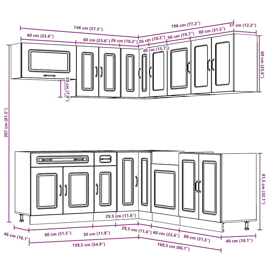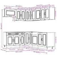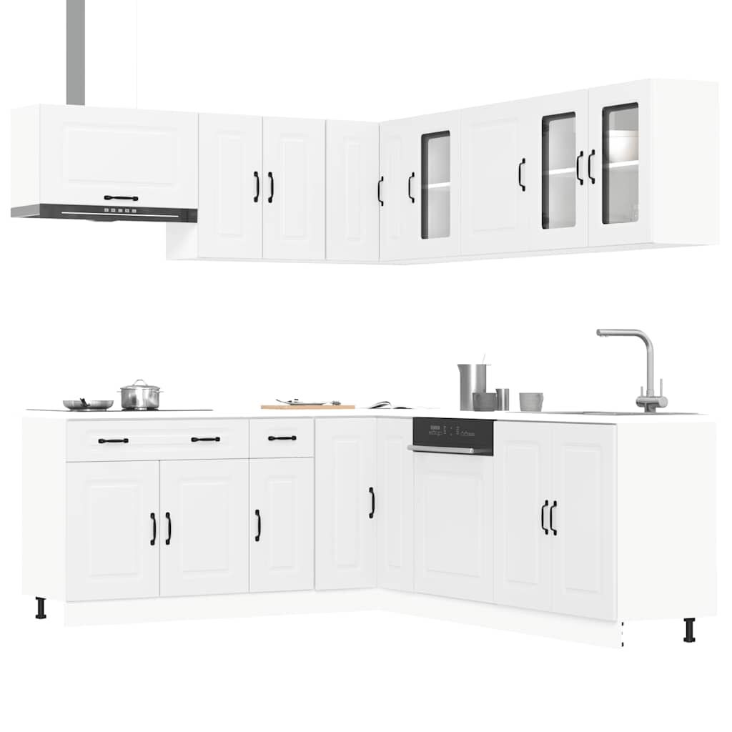 $1,410.29This 11-piece kitchen cabinet set, with its elegant design, optimises your kitchen space and provides ample storage space for your personal belongings! Stable and durable material: Engineered wood is a durable and stable material with a smooth surface that is resistant to moisture, warping, and splitting, making it a reliable choice for a variety of projects.Ample storage space: The kitchen cabinet set has many compartments, and offers sufficient space to store bowls, plates, pots, and other kitchen appliances.Adjustable feet: The bottom cabinets feature adjustable feet that can be adjusted in height to suit your kitchen layout.Easy to maintain: Thanks to its smooth surface, these kitchen cabinets are easy to clean with a damp cloth and require less maintenance. Warning:To prevent it from tipping over, this product must be used with the provided wall attachment device. Good to know:Screw(s) and plug(s) for inside the wall are not included. Seek and use screw(s) and plug(s) suitable for your walls. If you are uncertain, seek professional advice. Read and follow each step of the instruction carefully.The worktop, sink and faucet are not included in the delivery.