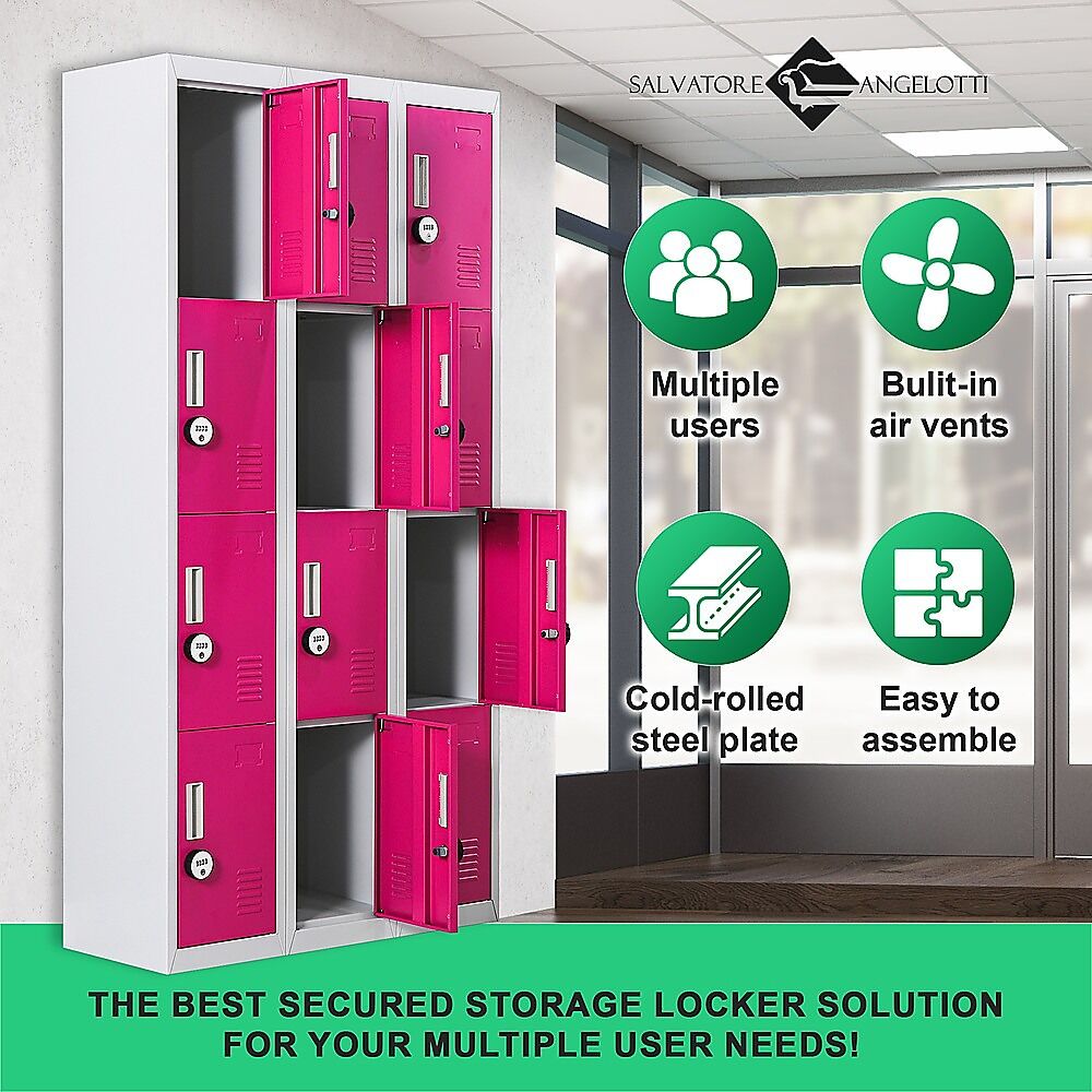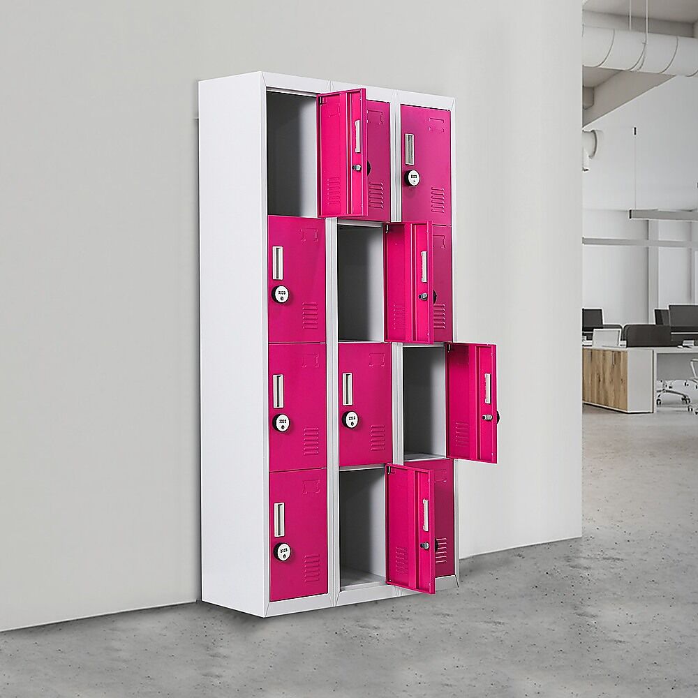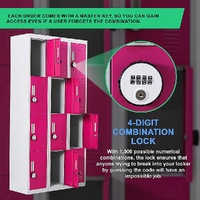 The unit has 12 individual locker compartments stacked in a 3 x 4 grid. Each locker provides ample space for personal items and can hold up to 30 kg. Built-in ventilations slits keep the stored items from smelling musty. Users may also customise their locker with a name tag or label in the designated slot provided. This comes comes with 4-digit combination lock to ensure safety of your belongings.
