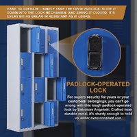 The unit has 12 individual locker compartments stacked in a 3 x 4 grid. Each locker provides ample space for personal items and can hold up to 30 kg. Built-in ventilations slits keep the stored items from smelling musty. Users may also customise their locker with a name tag or label in the designated slot provided. This comes comes with padlock-operated lock to ensure safety of your belongings.