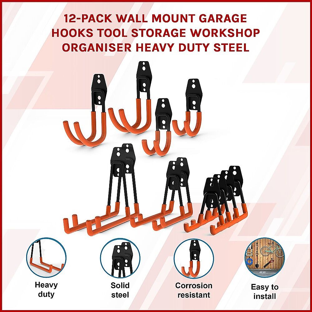 $69.55Need an efficient, yet great-looking storage solution for your garage? This 12-hook set of heavy-duty hooks from Randy Travis Machinery is the perfect thing. Crafted from sturdy steel, these high-quality wall-mounted hooks can hold power tools, weed cutters, ladders, brooms, shovels, lawn chairs, and even bicycles to keep them from taking up valuable floor space. It's the perfect way to cut the clutter without getting rid of a single tool.
