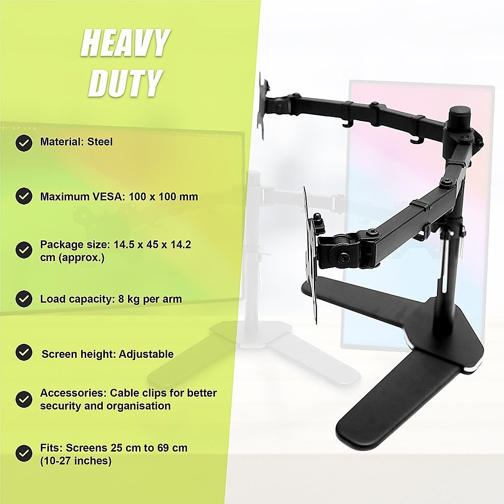 $88.35Whether you prefer to stand or sit at workor a healthy blend of the two, this dual monitor stand by Randy Travis Machinery is a perfect choice. Holding two LCD or LED monitors of sizes that vary between 13 and 27 inches, this stand gives you the flexibility at work that will help you become happier on the joband more productive as a result.