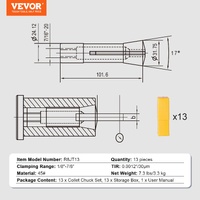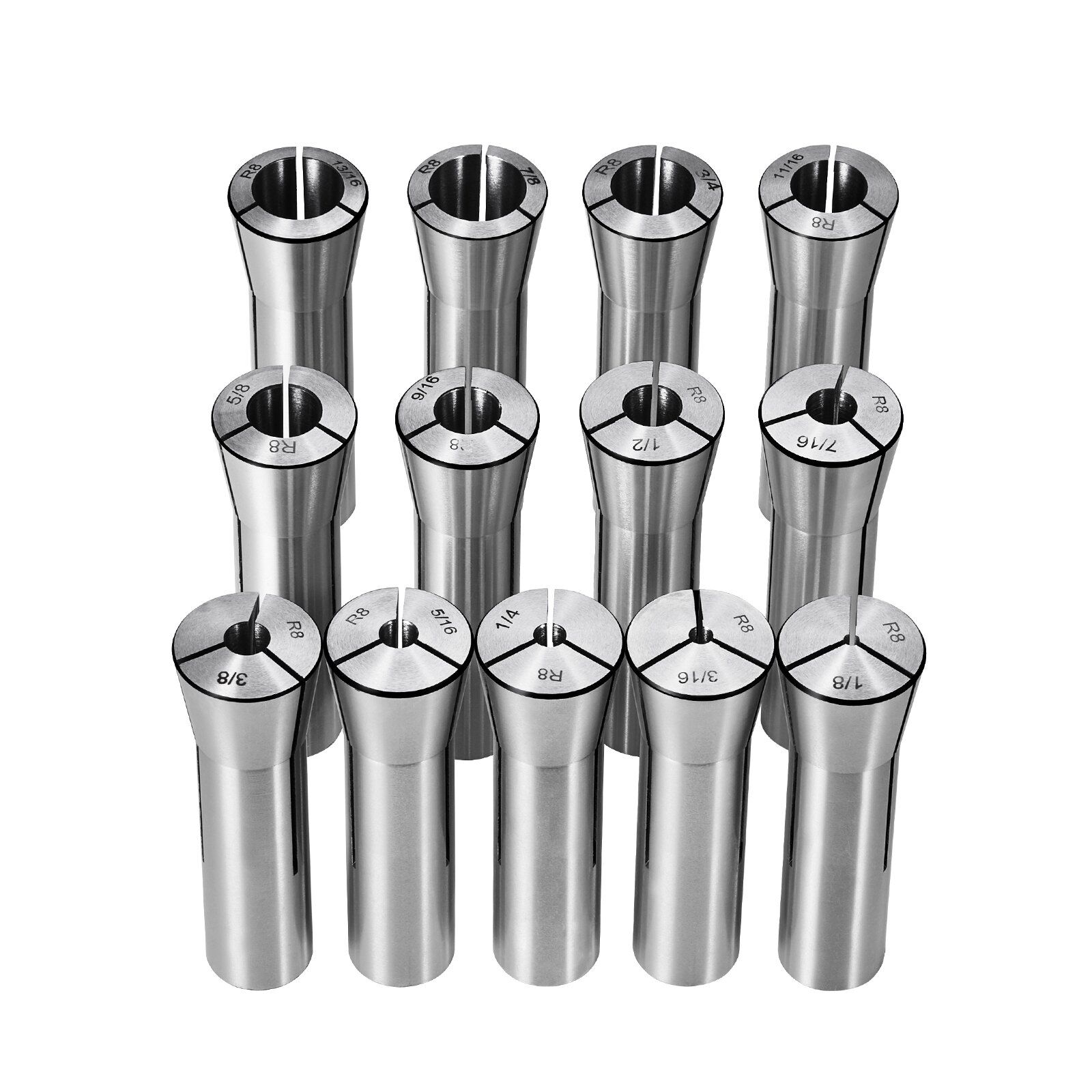 Our R8 collet chuck set includes 13 different collet chuck sizes to accommodate various needs: 1/2 inch, 1/4 inch, 1/8 inch, 11/16 inch, 13/16 inch, 3/16 inch, 3/4 inch, 3/8 inch, 5/16 inch, 5/8 inch, 7/16 inch, 7/8 inch, and 9/16 inch.