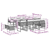 This garden dining set is a great choice for al fresco dining or just relaxing in the garden, backyard, or on the patio. Durable material: PE rattan, also known as poly rattan, is a strong, low-maintenance synthetic material that looks like natural rattan. It's lightweight, easy to clean, and commonly used for outdoor furniture due to its durability and weather-resistant properties.Compact storage: These chairs have a flap backrest that can be folded down, making it easy to store them under the table. When folded, they neatly fit under the table, forming a space-saving cube shape. Additionally, the stools can also be stored under the chairs, further maximising space efficiency.Comfortable seat experience: This outdoor furniture, complete with thickly padded cushions, offers a comfortable seating experience.Removable and washable cover: These seat cushions feature removable covers for easy washing and maintenance. The cushion covers have a flap at the back for easy attachment to the backrests.Stable and easy-to-clean tabletop: This garden table has an acacia wood top that is sturdy, durable, and easy to clean with a damp cloth. Good to know: To make sure your outdoor furniture stays beautiful, we recommend protecting it with a waterproof cover.