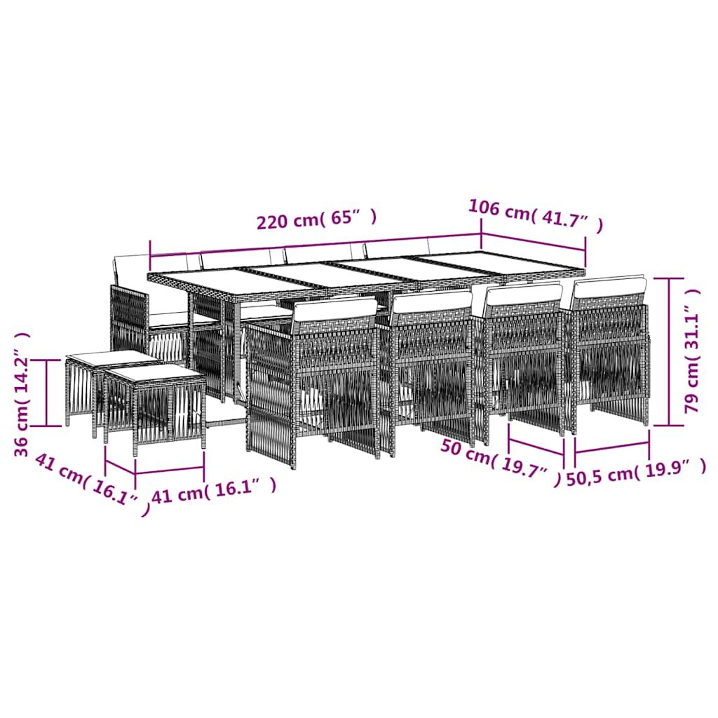 This garden dining set is a great choice for al fresco dining or just relaxing in the garden, backyard, or on the patio. Durable material: PE rattan, also known as poly rattan, is a strong, low-maintenance synthetic material that looks like natural rattan. It's lightweight, easy to clean, and commonly used for outdoor furniture due to its durability and weather-resistant properties.Compact storage: These chairs have a flap backrest that can be folded down, making it easy to store them under the table. When folded, they neatly fit under the table, forming a space-saving cube shape. Additionally, the stools can also be stored under the chairs, further maximizing space efficiency.Comfortable seat experience: This outdoor furniture, complete with thickly padded cushions, offers a comfortable seating experience.Removable and washable cover: These cushions feature removable covers for easy washing and maintenance. The cushion covers have a flap at the back for easy attachment to the backrests.Glass tabletop: The outdoor table's top is made from strong and durable tempered glass, making it easy to clean with a damp cloth and adding a touch of elegance to your outdoor space. Good to know: To make sure your outdoor furniture stays beautiful, we recommend protecting it with a waterproof cover.