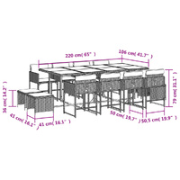 This garden dining set is a great choice for al fresco dining or just relaxing in the garden, backyard, or on the patio. Durable material: PE rattan, also known as poly rattan, is a strong, low-maintenance synthetic material that looks like natural rattan. It's lightweight, easy to clean, and commonly used for outdoor furniture due to its durability and weather-resistant properties.Compact storage: These chairs have a flap backrest that can be folded down, making it easy to store them under the table. When folded, they neatly fit under the table, forming a space-saving cube shape. Additionally, the stools can also be stored under the chairs, further maximising space efficiency.Comfortable seat experience: This outdoor furniture, complete with thickly padded cushions, offers a comfortable seating experience.Removable and washable cover: These seat cushions feature removable covers for easy washing and maintenance. The cushion covers have a flap at the back for easy attachment to the backrests.Glass tabletop: The outdoor table's top is made from strong and durable tempered glass, making it easy to clean with a damp cloth and adding a touch of elegance to your outdoor space. Good to know: To make sure your outdoor furniture stays beautiful, we recommend protecting it with a waterproof cover.