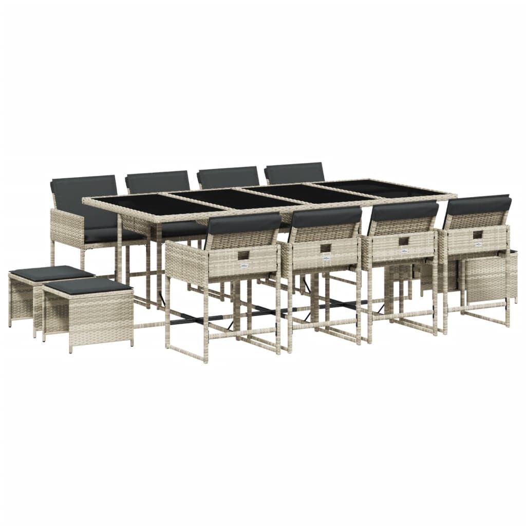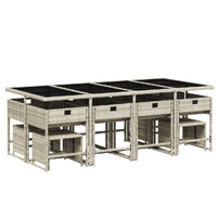 This garden dining set is a great choice for al fresco dining or just relaxing in the garden, backyard, or on the patio. Durable material: PE rattan, also known as poly rattan, is a strong, low-maintenance synthetic material that looks like natural rattan. It's lightweight, easy to clean, and commonly used for outdoor furniture due to its durability and weather-resistant properties.Compact storage: These chairs have a flap backrest that can be folded down, making it easy to store them under the table. When folded, they neatly fit under the table, forming a space-saving cube shape. Additionally, the stools can also be stored under the chairs, further maximising space efficiency.Comfortable seat experience: This outdoor furniture, complete with thickly padded cushions, offers a comfortable seating experience.Removable and washable cover: These seat cushions feature removable covers for easy washing and maintenance. The cushion covers have a flap at the back for easy attachment to the backrests.Glass tabletop: The outdoor table's top is made from strong and durable tempered glass, making it easy to clean with a damp cloth and adding a touch of elegance to your outdoor space. Good to know: To make sure your outdoor furniture stays beautiful, we recommend protecting it with a waterproof cover.