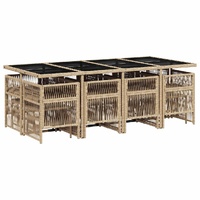 This garden dining set is a great choice for al fresco dining or just relaxing in the garden, backyard, or on the patio. Durable material: PE rattan, also known as poly rattan, is a strong, low-maintenance synthetic material that looks like natural rattan. It's lightweight, easy to clean, and commonly used for outdoor furniture due to its durability and weather-resistant properties.Compact storage: These chairs have a flap backrest that can be folded down, making it easy to store them under the table. When folded, they neatly fit under the table, forming a space-saving cube shape. Additionally, the stools can also be stored under the chairs, further maximizing space efficiency.Comfortable seat experience: This outdoor furniture, complete with thickly padded cushions, offers a comfortable seating experience.Removable and washable cover: These cushions feature removable covers for easy washing and maintenance. The cushion covers have a flap at the back for easy attachment to the backrests.Glass tabletop: The outdoor table's top is made from strong and durable tempered glass, making it easy to clean with a damp cloth and adding a touch of elegance to your outdoor space. Good to know: To make sure your outdoor furniture stays beautiful, we recommend protecting it with a waterproof cover.