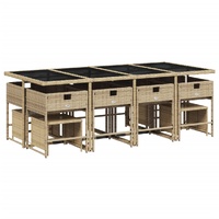 This garden dining set is a great choice for al fresco dining or just relaxing in the garden, backyard, or on the patio. Durable material: PE rattan, also known as poly rattan, is a strong, low-maintenance synthetic material that looks like natural rattan. It's lightweight, easy to clean, and commonly used for outdoor furniture due to its durability and weather-resistant properties.Compact storage: These chairs have a flap backrest that can be folded down, making it easy to store them under the table. When folded, they neatly fit under the table, forming a space-saving cube shape. Additionally, the stools can also be stored under the chairs, further maximising space efficiency.Comfortable seat experience: This outdoor furniture, complete with thickly padded cushions, offers a comfortable seating experience.Removable and washable cover: These seat cushions feature removable covers for easy washing and maintenance. The cushion covers have a flap at the back for easy attachment to the backrests.Glass tabletop: The outdoor table's top is made from strong and durable tempered glass, making it easy to clean with a damp cloth and adding a touch of elegance to your outdoor space. Good to know: To make sure your outdoor furniture stays beautiful, we recommend protecting it with a waterproof cover.