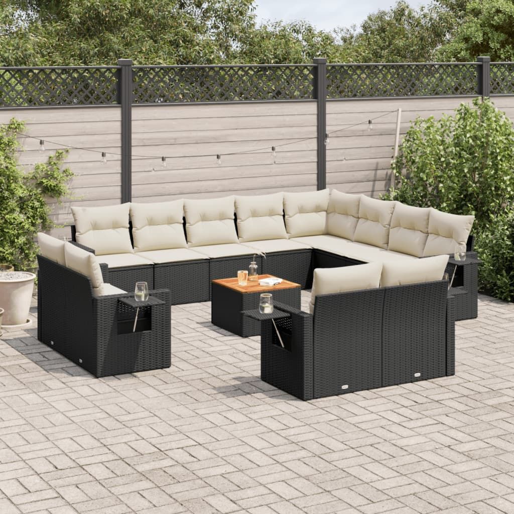 This garden sofa set is the perfect addition to your backyard, terrace, or patio, providing a comfortable and inviting space for chatting with family and friends or simply relaxing and enjoying the outdoors. Durable material: PE rattan, also known as poly rattan, is a strong, low-maintenance synthetic material that looks like natural rattan. It's lightweight, easy to clean, and commonly used for outdoor furniture due to its durability and weather-resistant properties.Storage function with water-resistant bag: Each garden seat features storage space under the seat, complete with a water-resistant bag for storing cushions, toys, and other items. The inner bags have a top cover and can be securely fastened to the seats with hook-and-loop fasteners for added stability.Stable and easy-to-clean tabletop: This garden table has an acacia wood top that is sturdy, durable, and easy to clean with a damp cloth.Convenient side table: This outdoor furniture features foldable side tables with a gas spring on the armrests, providing convenient spots to keep your essentials within easy reach.Modular design: This outdoor furniture set has a modular design, making it completely flexible and easy to move around, so you can create a customised outdoor furniture arrangement. Good to know:To make sure your outdoor furniture stays beautiful, we recommend protecting it with a waterproof cover.
