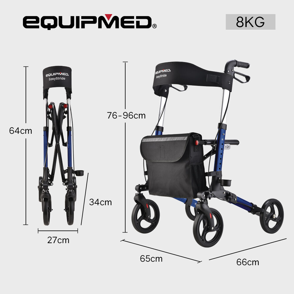 $200.21Practicality, reliability, comfort and smooth mobility is required to offer the freedom and confidence that is well deserved - and the Equipmed Easy Stride Rollator ticks all the boxes. Independence is only a step away thanks to the stylish ultra-light 8kg aluminium design with adjustable handle height. The handles themselves feature an ergonomic design and easy-squeeze dual-action brakes. A detachable front carry satchel allows for convenient storage of personal belongings and reading material.