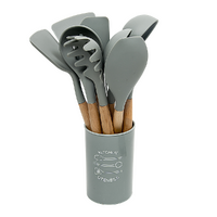 The set includes an attractive grey holder, hanging hooks, along with a pasta spoon, basting brush, serving spoon, solid spoon, slotted spoon, ladle, spoon rest, tongs, spatula, slotted turner, whisk, and a round spatula in other words, everything you need to cook a gourmet meal every day of the week. Coated with non-stick, non-scratch silicone, they won't damage your non-stick pans. So, make your life easier and your kitchen more organised with this lovely set of utensils. Order yours today!