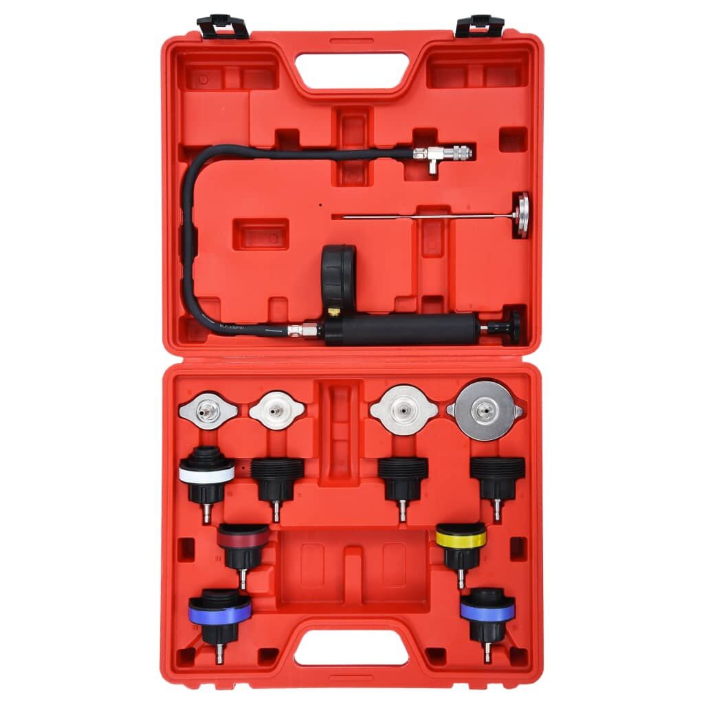 This quality universal radiator pressure tester kit consists of 14 pieces and will be an ideal workshop tool for car enthusiasts and automotive professionals alike. It is suitable for VW, Audi, Volvo, Saab, Mercedes-Benz, BMW, Renault, Porsche, Jaguar, Mitsubishi, Mazda, Toyota, Honda, Suzuki, Isuzu, Ford, GM, Chrysler, Fiat, Alfa Romeo, Lexus, Peugeot, Jeep, Land Rover, etc. This radiator pressure tester kit will help you find internal and external leaks in your cooling system. This tool kit allows you to change the coolant and test for leaks in the vehicle's cooling system, including the radiator, heater core and radiator cap, in a simple and straight-forward manner. Made of quality material, this pressure tester is very durable. The kit is delivered in a blow-molded case for easy storage and transport.