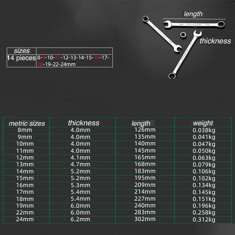 Metric sizes: 8mm, 9mm, 10mm, 11mm, 12mm, 13mm, 14mm, 15mm,16mm, 17mm, 18mm,19mm, 22mm, 24mm