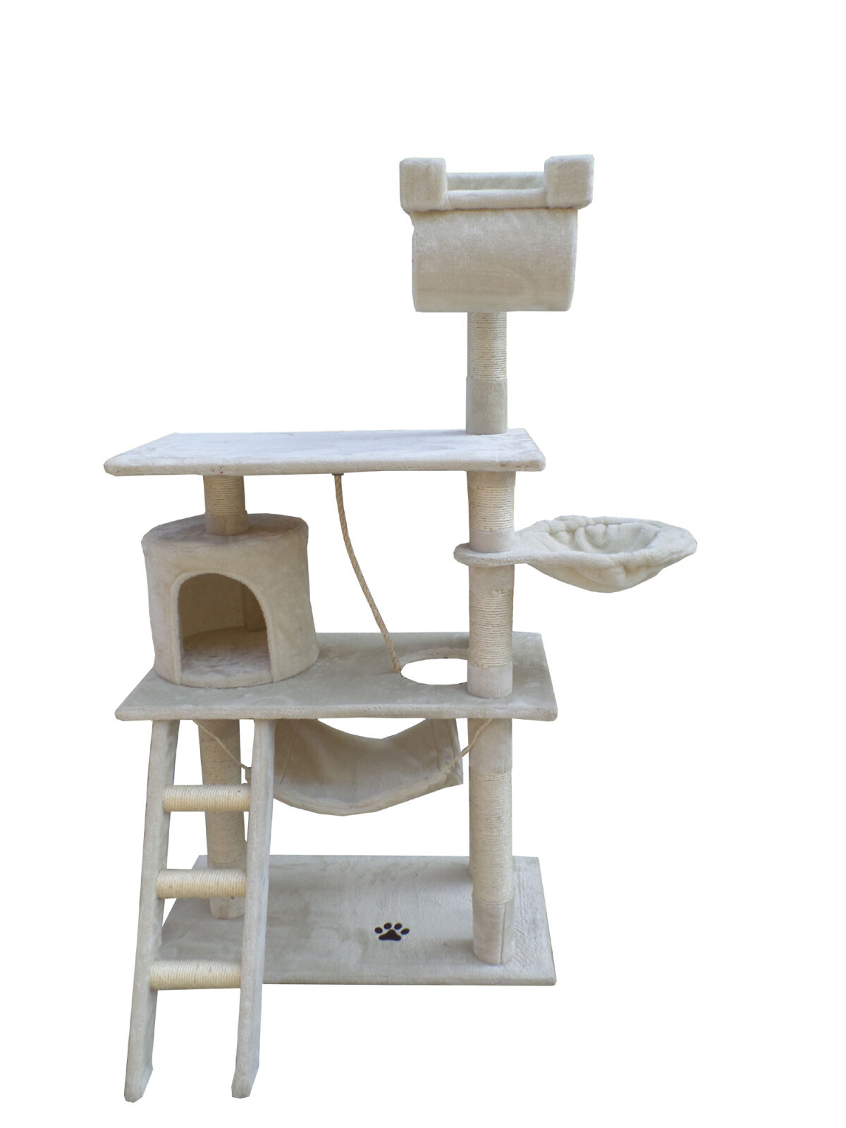 Our latest cat tree is the ultimate home for any cats. It combines scratching, perching, chasing, climbing and just plain fun all in one piece. The multiple platforms allow your cats to jump around; and the plush carpeted surface provides extra comfort.The cat tree comes with 2 bed cubes and a few platforms to provide some shelter. The tubes are wrapped with sisal ropes for your pets to scratch and play with. The sturdy base prevents any swaying so it is safe on any flat surface so you do not have to worry about injury to your cat. The stylish cat tree will perfectly blend in with your decor.