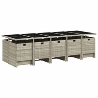 This garden dining set is a great choice for al fresco dining or just relaxing in the garden, backyard, or on the patio. Durable material: PE rattan, also known as poly rattan, is a strong, low-maintenance synthetic material that looks like natural rattan. It's lightweight, easy to clean, and commonly used for outdoor furniture due to its durability and weather-resistant properties.Compact storage: These chairs have a flap backrest that can be folded down, making it easy to store them under the table. When folded, they neatly fit under the table, forming a space-saving cube shape. Additionally, the stools can also be stored under the chairs, further maximising space efficiency. Comfortable seat experience: This outdoor furniture, complete with thickly padded cushions, offers a comfortable seating experience.Removable and washable cover: These seat cushions feature removable covers for easy washing and maintenance.Glass tabletop: The outdoor table's top is made from strong and durable tempered glass, making it easy to clean with a damp cloth and adding a touch of elegance to your outdoor space. Good to know: To make sure your outdoor furniture stays beautiful, we recommend protecting it with a waterproof cover.