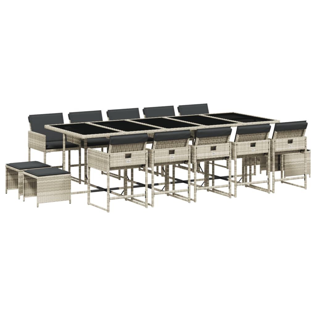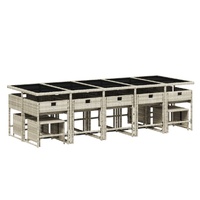 This garden dining set is a great choice for al fresco dining or just relaxing in the garden, backyard, or on the patio. Durable material: PE rattan, also known as poly rattan, is a strong, low-maintenance synthetic material that looks like natural rattan. It's lightweight, easy to clean, and commonly used for outdoor furniture due to its durability and weather-resistant properties.Compact storage: These chairs have a flap backrest that can be folded down, making it easy to store them under the table. When folded, they neatly fit under the table, forming a space-saving cube shape. Additionally, the stools can also be stored under the chairs, further maximising space efficiency.Comfortable seat experience: This outdoor furniture, complete with thickly padded cushions, offers a comfortable seating experience.Removable and washable cover: These seat cushions feature removable covers for easy washing and maintenance. The cushion covers have a flap at the back for easy attachment to the backrests.Glass tabletop: The outdoor table's top is made from strong and durable tempered glass, making it easy to clean with a damp cloth and adding a touch of elegance to your outdoor space. Good to know: To make sure your outdoor furniture stays beautiful, we recommend protecting it with a waterproof cover.