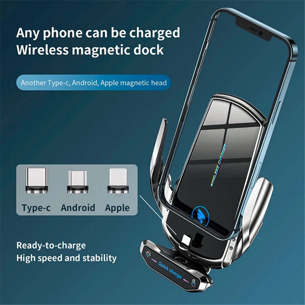 Stay powered on the road with this sleek 15W Wireless Car Charger Mount. Designed with smart auto-clamping technology and a sturdy air vent clip, this charger offers hassle-free one-hand operation for ultimate driving convenience. The magnetic charging tips make it compatible with most devices and protect your charging ports from wear. The included Type-C cable ensures fast and stable power delivery. Finished in a stylish silver color, it combines elegance with cutting-edge functionality the perfect addition to any vehicle.
