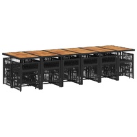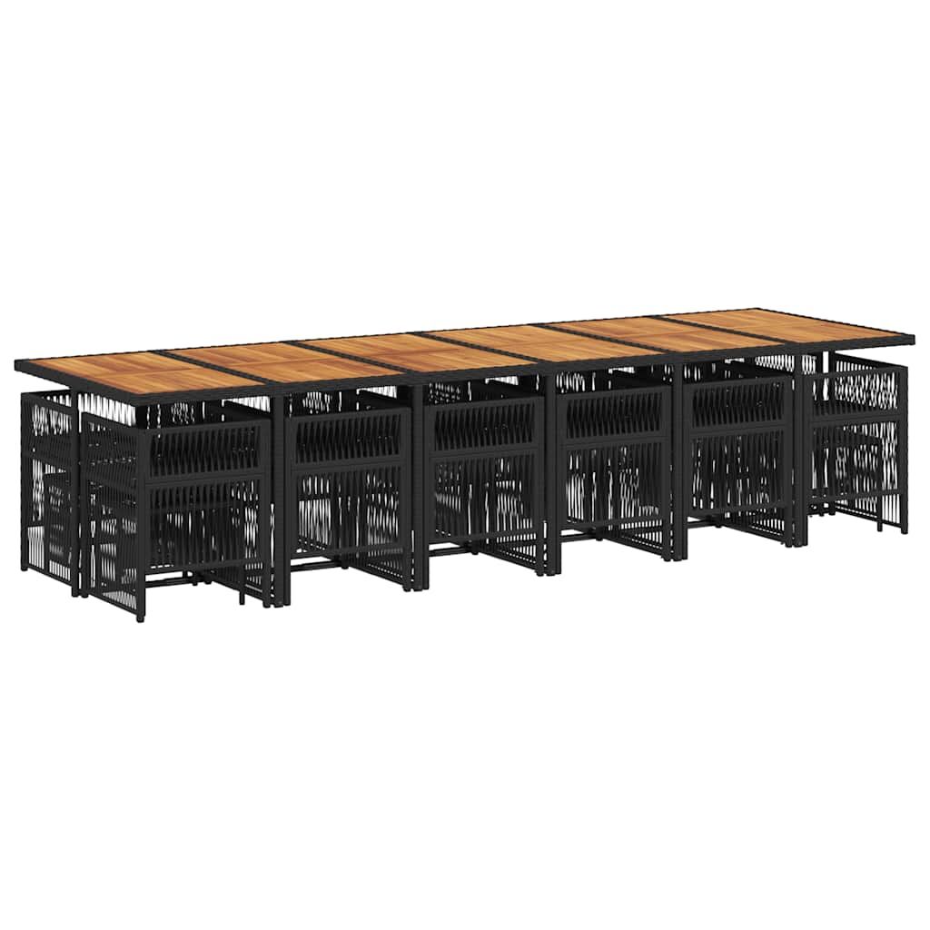 This garden dining set is a great choice for al fresco dining or just relaxing in the garden, backyard, or on the patio. Durable material: PE rattan, also known as poly rattan, is a strong, low-maintenance synthetic material that looks like natural rattan. It's lightweight, easy to clean, and commonly used for outdoor furniture due to its durability and weather-resistant properties.Compact storage: These chairs have a flap backrest that can be folded down, making it easy to store them under the table. When folded, they neatly fit under the table, forming a space-saving cube shape. Additionally, the stools can also be stored under the chairs, further maximizing space efficiency.Comfortable seat experience: This outdoor furniture, complete with thickly padded cushions, offers a comfortable seating experience.Removable and washable cover: These cushions feature removable covers for easy washing and maintenance. The cushion covers have a flap at the back for easy attachment to the backrests.Stable and easy-to-clean tabletop: This garden table has an acacia wood top that is sturdy, durable, and easy to clean with a damp cloth. Good to know: To make sure your outdoor furniture stays beautiful, we recommend protecting it with a waterproof cover.
