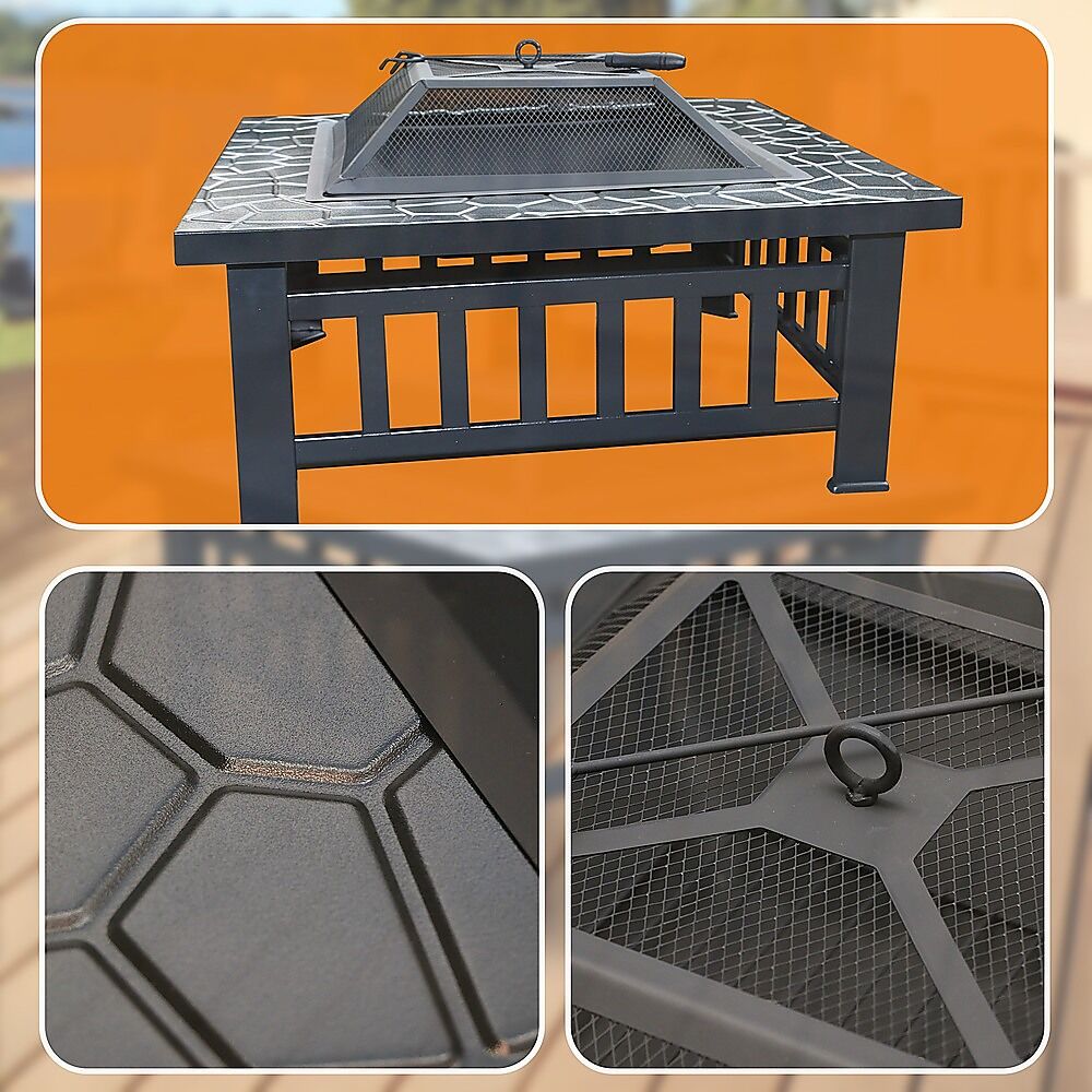 This attractive square fire pit is a must for any backyard or patio. You'll draw a crowd when you throw on mouth-watering steaks and delicious kabobs on this metal fire pit. Your gatherings will be a hit!
