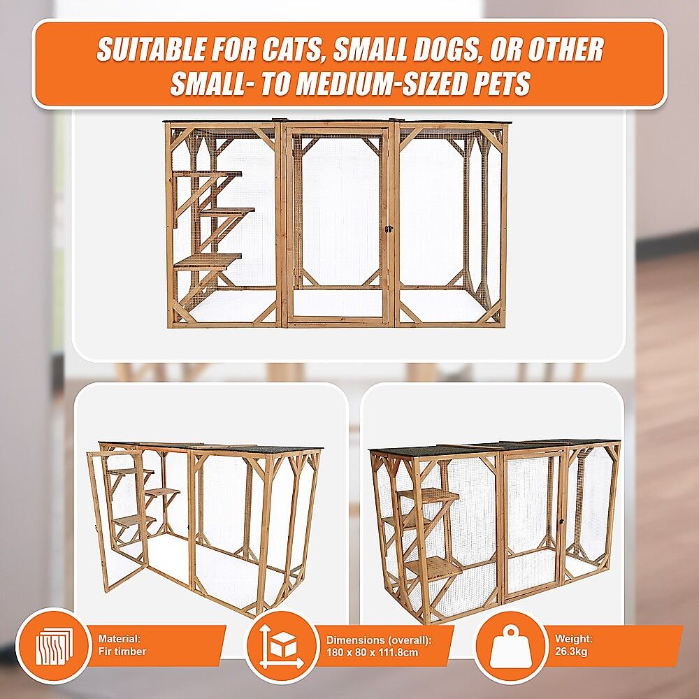Its rustic, natural design makes it an attractive addition to your garden or backyard, while its durable construction ensures that it will give your family pets years of use. Coated with a water-resistant, non-toxic sealant, the timber frame won't warp or split like untreated timber. Its generous ground coverage can easily accommodate multiple pets, and its large front door allows you to enter and exit easily. If you want to give your pets the benefit of being out in nature while staying safe, this is the perfect solution. Give your pets the gift of safety today!