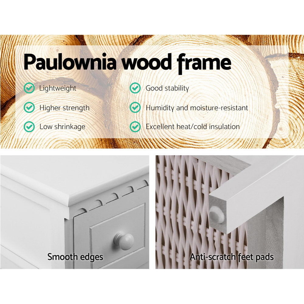 $125.95Looking for that cottagecore aesthetic without moving to the countryside? Add a chic, rustic presence to your home with the Artiss 3-basket Cabinet. Beautifully crafted in an endearing combination of Paulownia wood, MDF board, plywood and PP material, this cabinet evokes a charming, simple living feel and is useful in so many ways. The design has a timeless appeal, and its practicality is enhanced by the two deep drawers and three movable baskets with cloth liners that are washable for easy maintenance. The cabinet will match perfectly with your existing décor thanks to its neutral white tones, so you can use it in any room. Not least, the anti-scratch feet pads will help to keep your floor in pristine condition. The cabinet comes fully assembled so you can place it straight out of the box. Get yours today and create your perfect home.