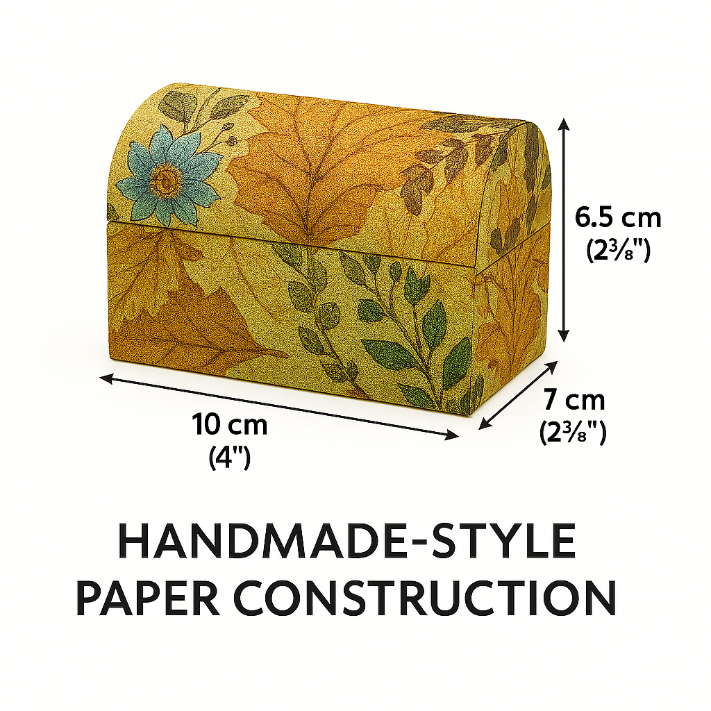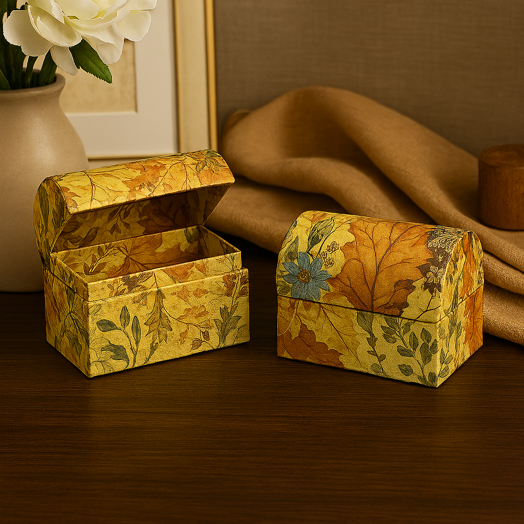 This 2‑Pack Decorative Floral Storage Box Bundle combines two beautifully patterned boxes featuring warm autumn leaf and floral designs. Each box is crafted from decorative paper with a handmade aesthetic, making them perfect for gifting, organising, or adding a natural accent to your home décor. The mixed shapes (rectangular, hinged‑lid, rounded‑top) create a visually appealing set ideal for jewellery, keepsakes, craft items, or boutique-style displays.