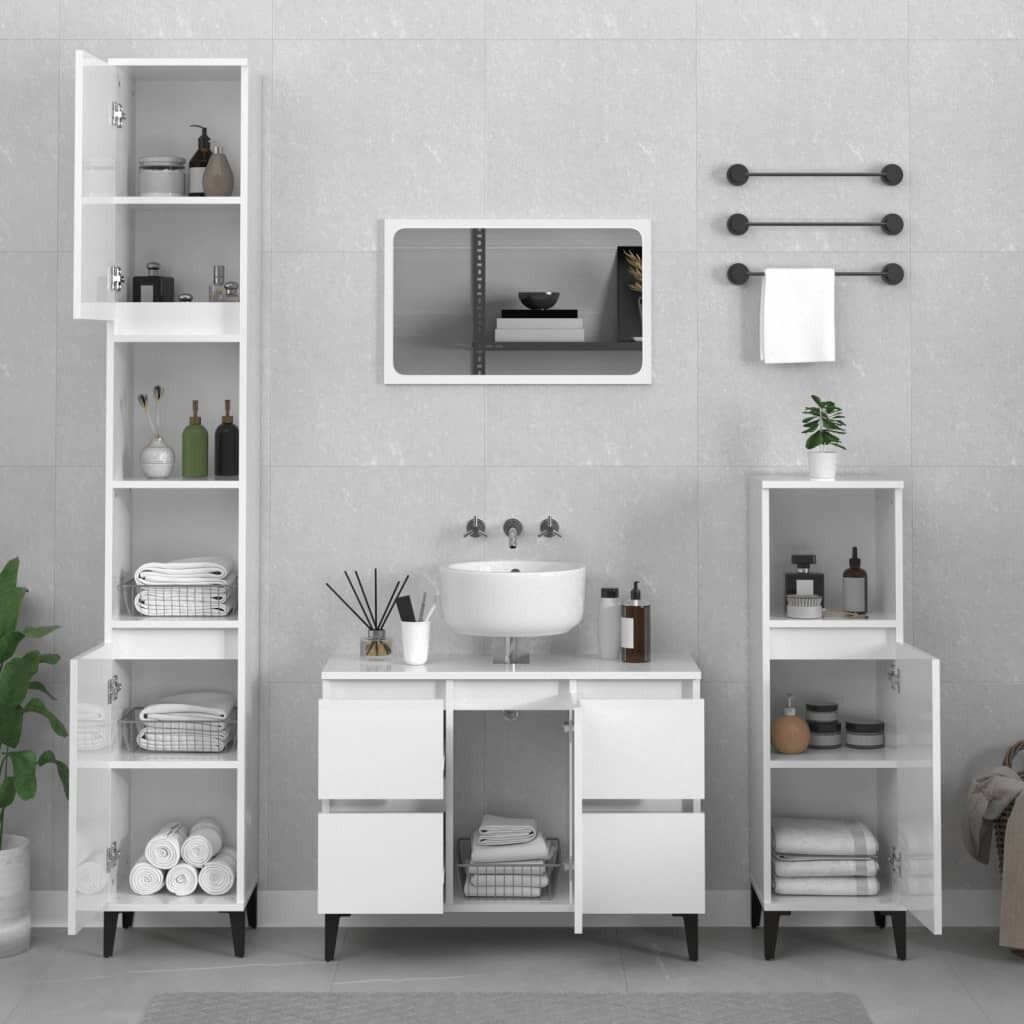 $166.33This stylish bathroom furniture set, featuring spacious storage space, is an excellent addition to your bathroom, giving it a tidy and striking appearance! Durable material: The engineered wood is of exceptional quality with a smooth surface and features strength, stability and resistance to moisture.Ample storage space: The bathroom sink cabinet offers ample storage space for keeping your bathroom supplies well organised.Metal feet: The metal feet add a modern and calm style to your interior while ensuring stability.Practical mirror: Use the included mirror to neat your daily dressing. It also adds an excellent appearance to your home decor.Easy-to-clean surface: The bathroom vanity unit is easy to clean with a damp cloth. Warning:To prevent it being overturned, this product must be used with the provided wall attachment device. Good to know:Screws and plugs for inside the wall are not included. We advise to find and use screws and plugs suitable specifically for your walls. If you're not sure, you can consult with a professional. Please read and follow each step of the instructions.