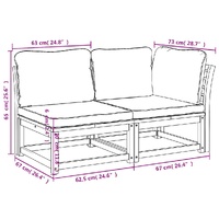 This wooden garden lounge set with cushions has an elegant design and is a great choice for relaxing and enjoying in the garden or patio. Solid acacia wood: Solid acacia wood is a beautiful natural material. Acacia wood is a tropical hardwood, which is dense, sturdy, and durable.Comfortable seat experience: The backrest and the thickly-padded cushions make the garden sofa set more comfortable to sit on.Slatted design: The slatted design of the wooden lounge set effectively prevents water from pooling, ensuring that the seat remains dry and free from potential rot.Modular design: This outdoor furniture set features a modular design, making it completely flexible and easy to move around to suit any setting. You can combine it with other modular segments available in the drop-down menu to create your own personal garden lounge set configurations! Good to know:To make sure your outdoor furniture stays beautiful, we recommend protecting it with a waterproof cover.