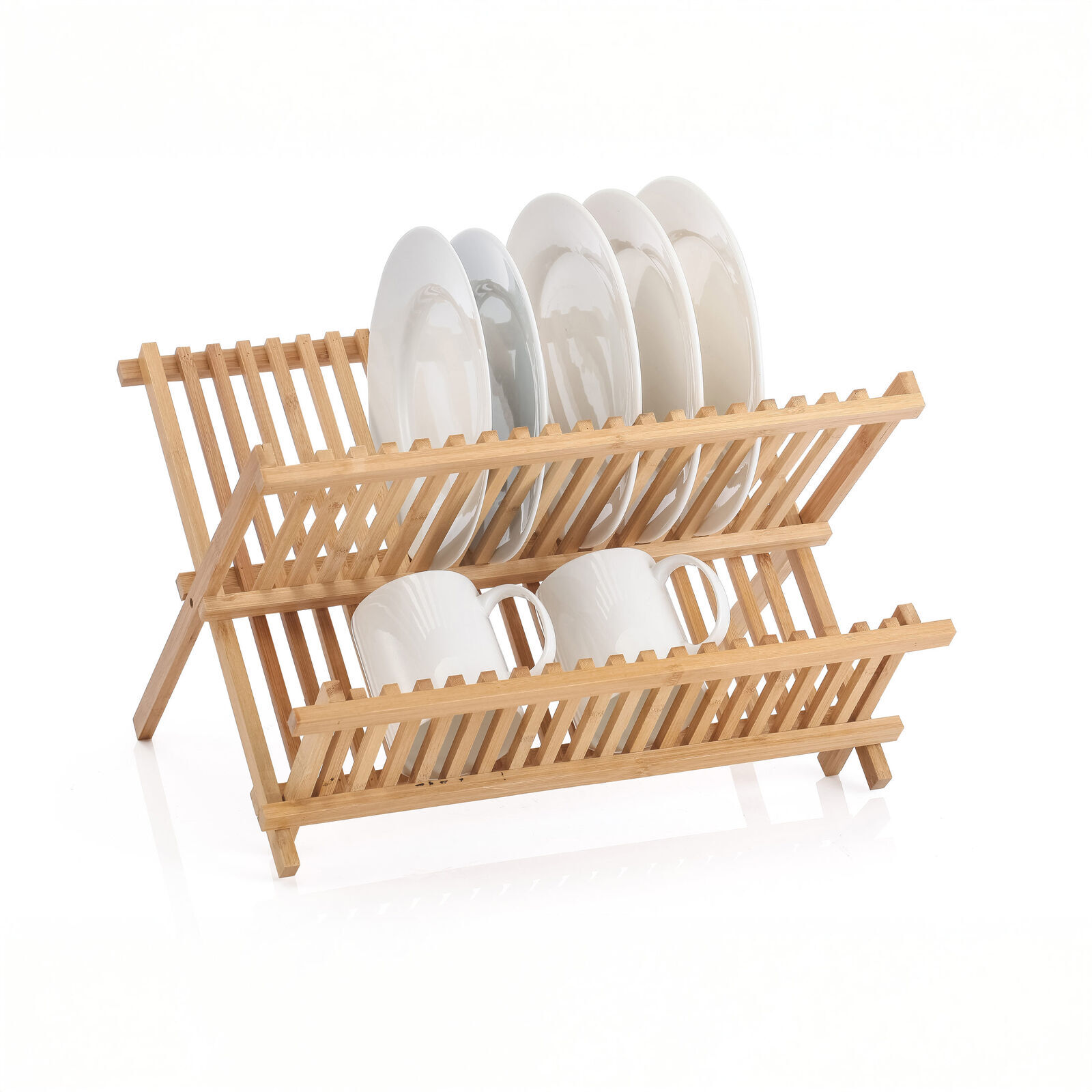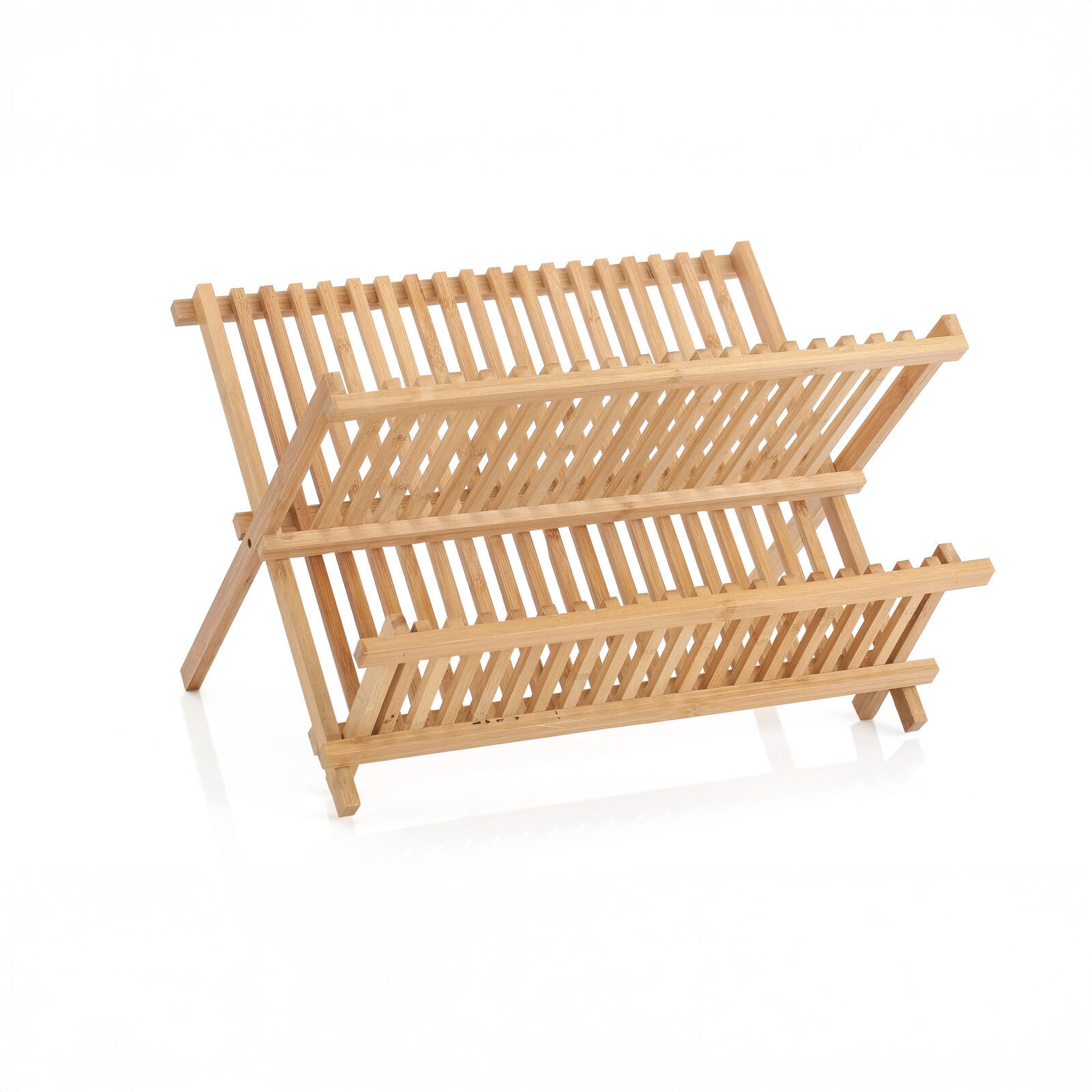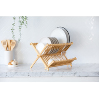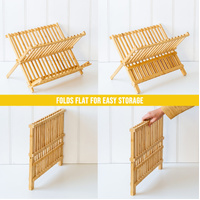 Keep your kitchen neatwith this foldable bamboo dish rack. Its sturdy X-shape design holds plates, bowls, and cups securely, while the natural bamboo adds a stylish touch. Lightweight and space-saving, it folds flat for easy storage when not in use.