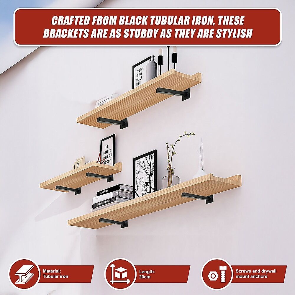 Crafted from black tubular iron, these brackets are as sturdy as they are stylish. Their neutral black colour blends into the background while their unique design hides most of the hardware. They're easy to install in mere minutes and come with all the hardware you need to get the job done. Thanks to their sturdy construction, each bracket can hold up to 38kg of items.