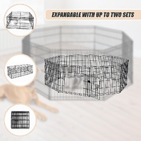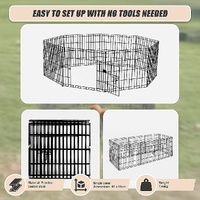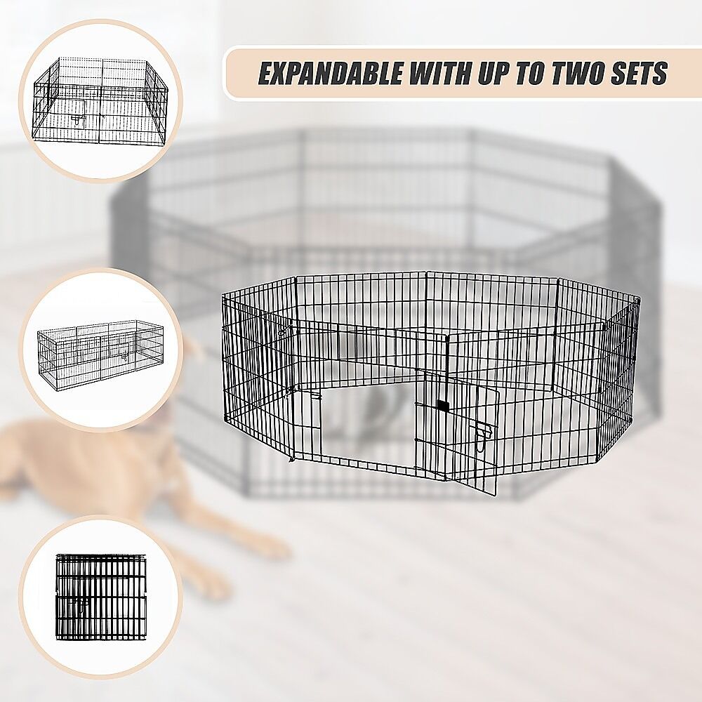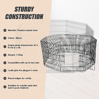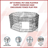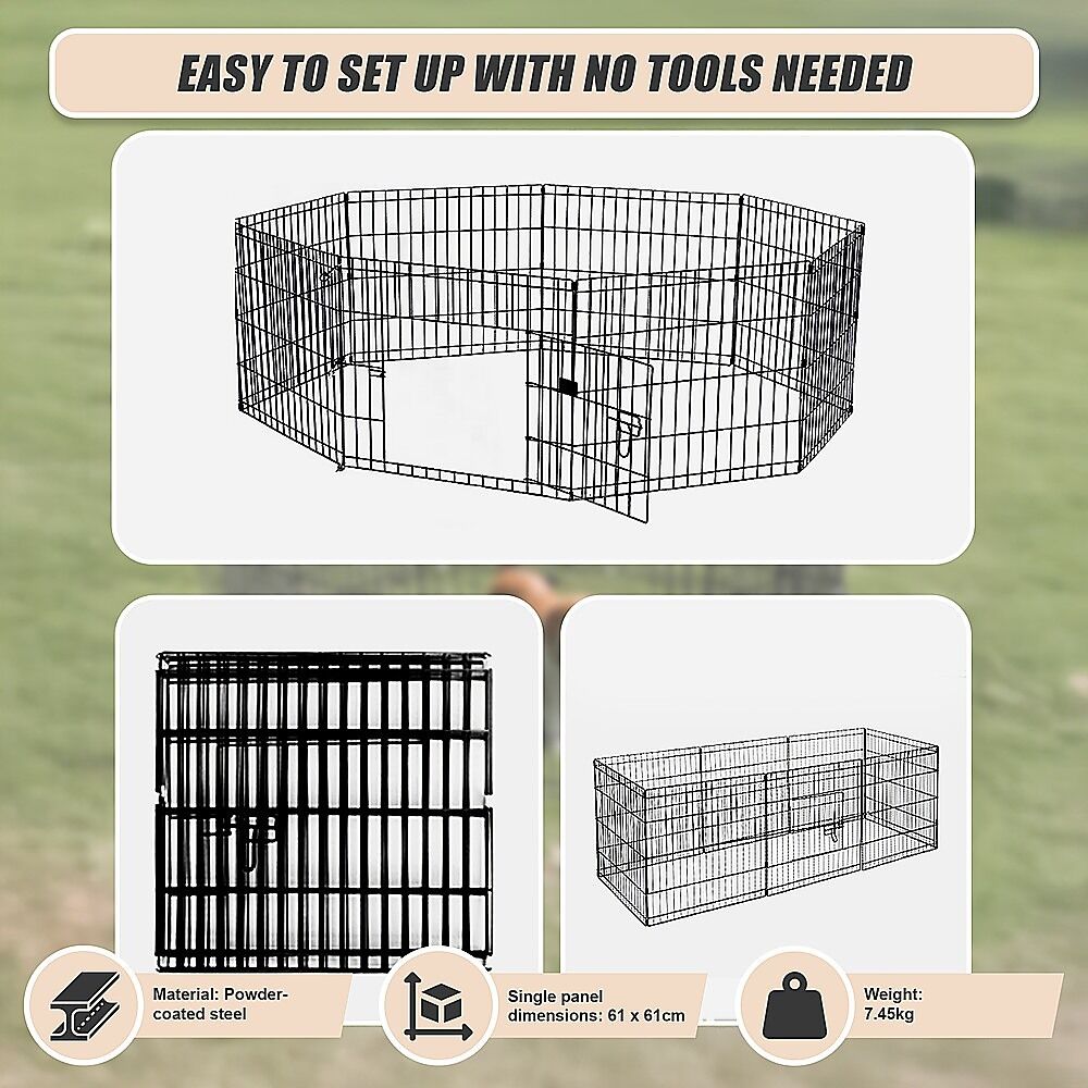 This pet playpen is easy to install and easy to fold away for storage. With a bolt latch on the access door, two locks, and round edges, your furry friend will stay safe and secure. At 24 inches in height, it works with small dogs and puppies, as well as small kittens, guinea pigs, ducks, rabbits, and other small pets that aren't good climbers. Crafted from powder-coated steel, it's built to last for years, even with everyday use. Give your pet a zone of its own with a special place to play. Get your pet playpen today!