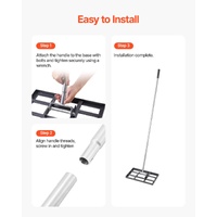 The package includes instruction manual, gloves and installation wrench tool, that allows you to quickly assemble and disassemble the leveling rake. Just align the handle threads, screw in and tighten, connect the base and plate with bolts, using wrench to tighten. It is simple and effortless to install.