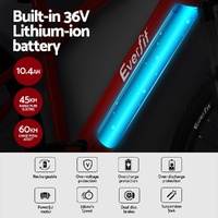 frame bike is easy to assemble, water-resistant, and perfect for mountain biking or exploring urban roads. The powerful 250W motor is paired with SHIMANO 7-speed gears and derailleur, making any terrain easy to tackle. With a 36V 10.4Ah removable rechargeable Li-ion battery, enjoy speeds up to 25km/h and a range of up to 60km on a single charge. Stay informed with the smart LED display panel and travel comfortably with the suspension front fork, height-adjustable saddle, and front and rear disc brakes. Our electric bike even comes with a built-in headlight and reflector for safe riding, while the durable wheels and tyres provide a smooth ride on a wide range of terrains. Suitable for riders with heights between 160-190cm and a weight capacity of 120kg. Charge time is between 6-8 hours. Get your electric mountain bike today for an unforgettable ride.