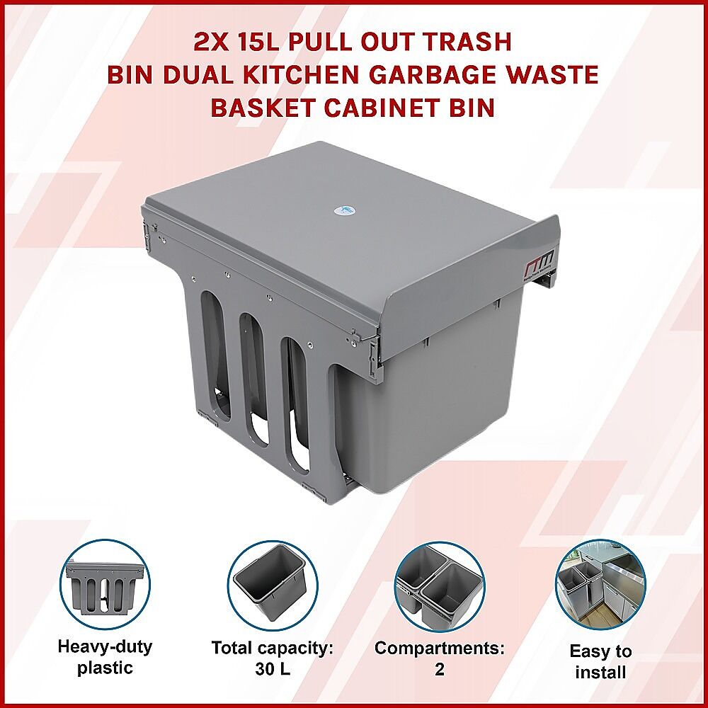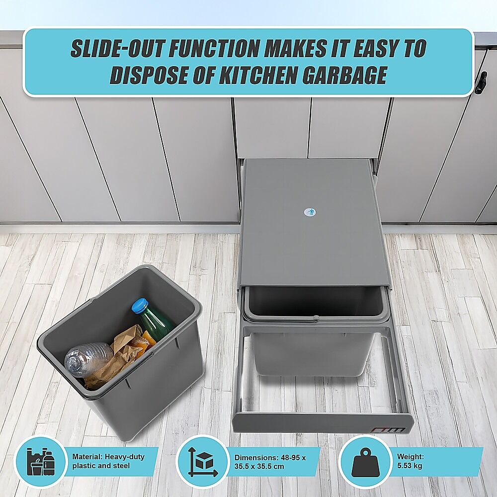$146.63If you recycle (and who doesn't, these days?), you need this dual pull-out kitchen rubbish bin from Randy Travis Machinery. It fits right under your under-sink cabinet, keeping your rubbish disposal system out of sight. Crafted from durable, heavy-duty plastic and steel slide rails, this waste disposal system can stand up under years of heavy use. Simply close the removable lid after you dispose of your kitchen rubbish to prevent odour build-up. With a full capacity of 30 litres, it can easily hold all your daily kitchen rubbish, avoiding extra trips outside.