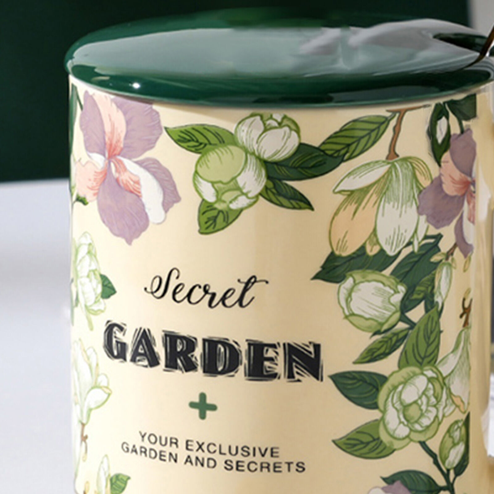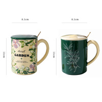 2 Set High-Fired Ceramic Porcelain Mug Set with Lid Tea Spoon Vintage Floral 400ml Green