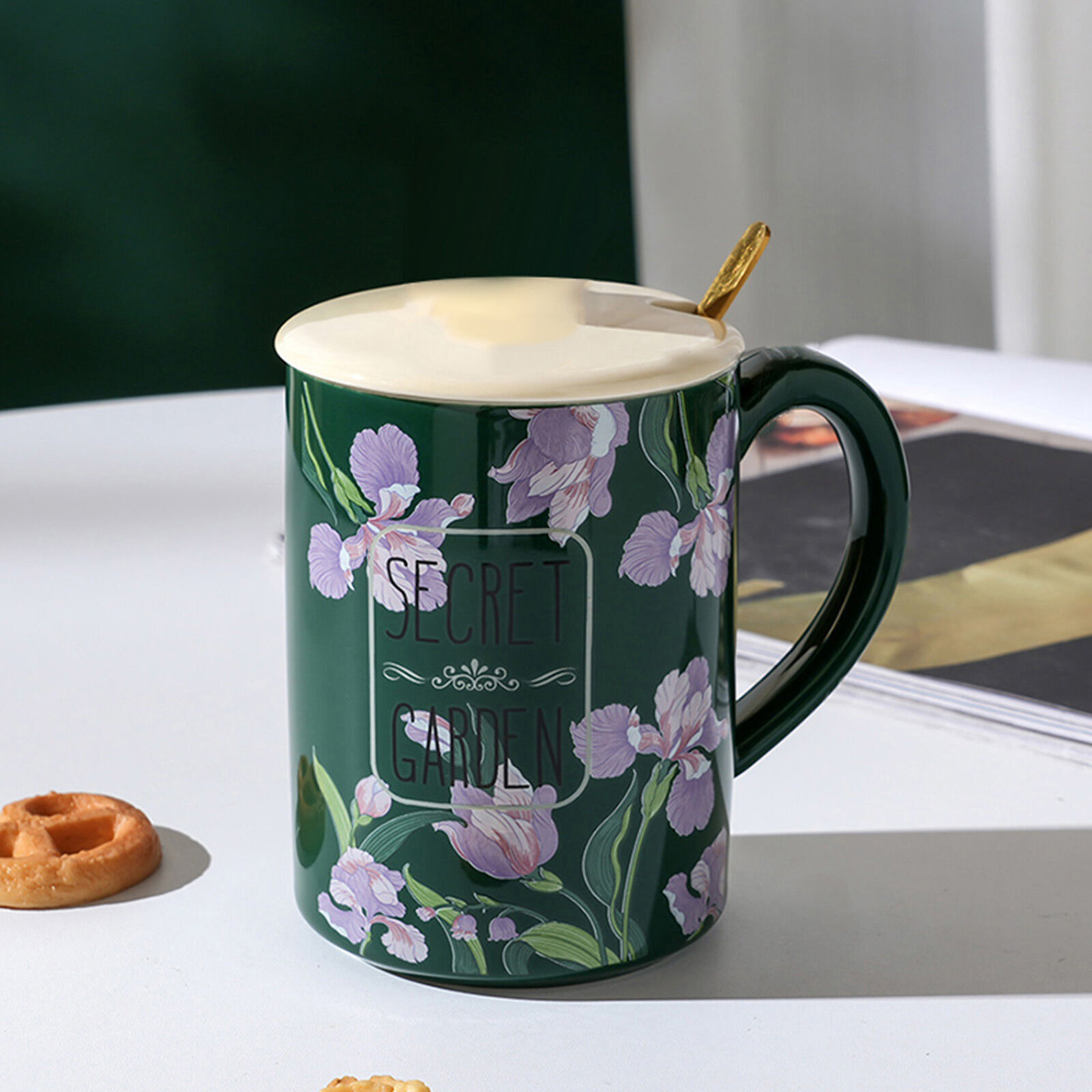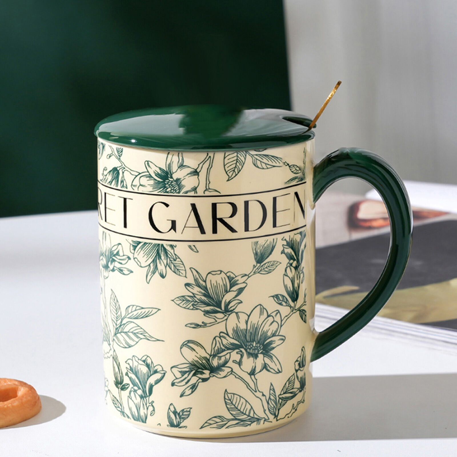 2 Set High-Fired Ceramic Porcelain Mug Set with Lid Tea Spoon Vintage Floral 400ml Green