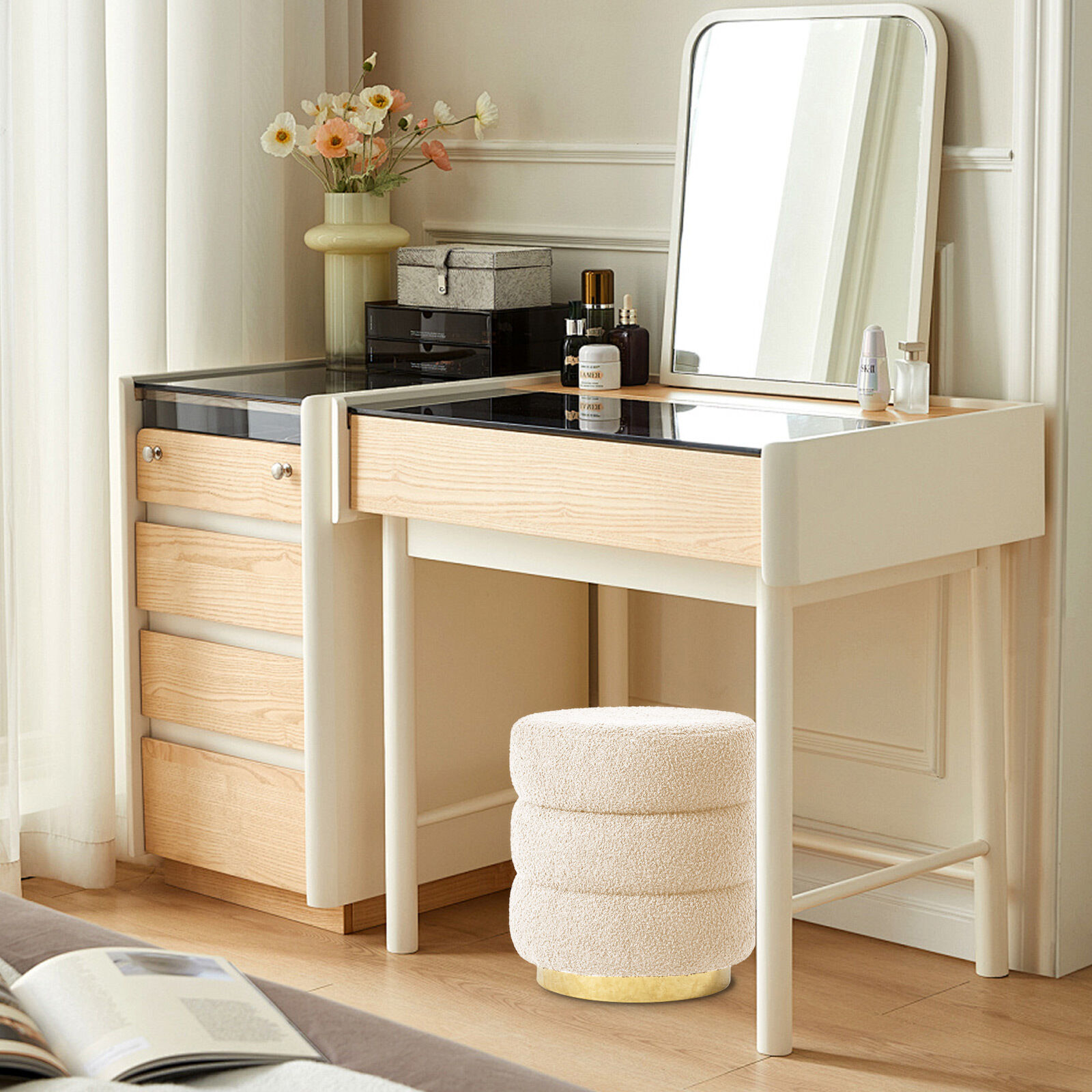 The irresistibly soft teddy fleece upholstery, featuring a luxuriously curly texture, adds a cozy, inviting touch that is perfect for any space. The chic gold base elevates the overall design, making this ottoman the ideal accent piece for your living room, bedroom, or entryway.