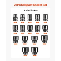 This effort-saving 3/4 inches drive impact socket set comes with 16 deep impact drive sockets: 3/4", 7/8", 15/16", 1", 1-1/16", 1-1/8", 1-3/16", 1-1/4", 1-5/16", 1-3/8", 1-7/16", 1-1/2", 1-5/8", 1-3/4", 1-7/8", 2"