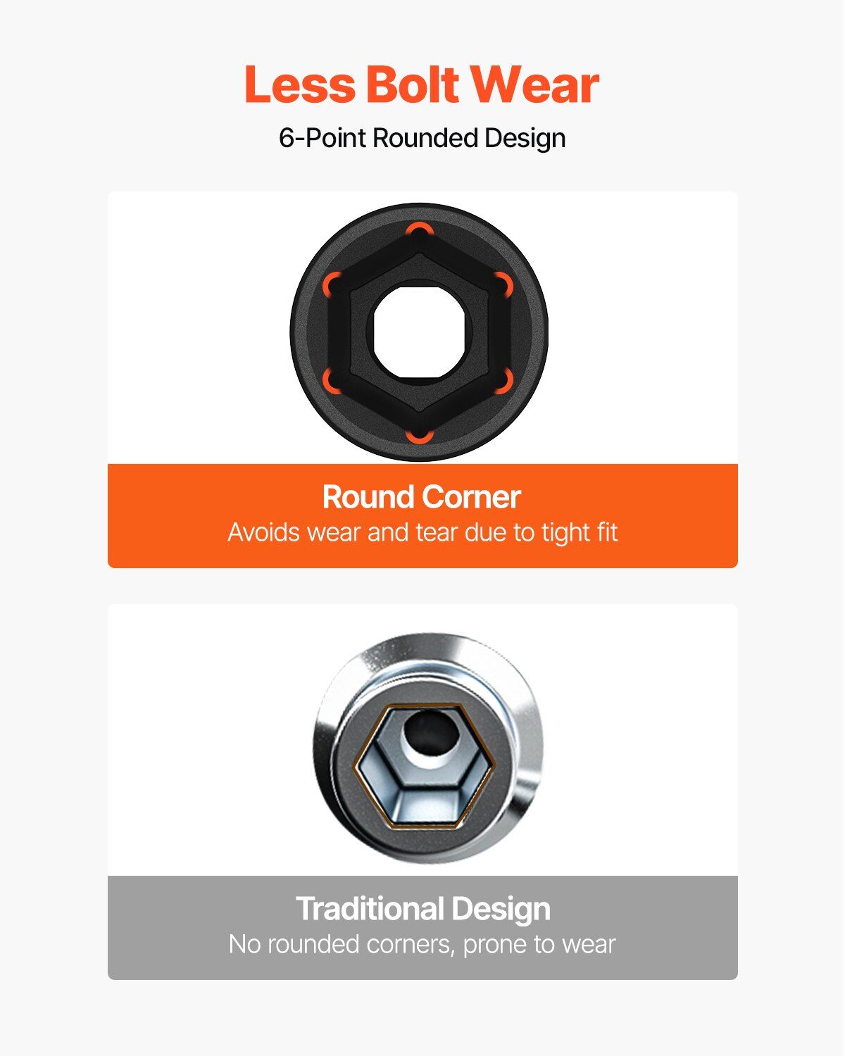 Whether you drive them with an impact wrench or by hand, these premium chrome vanadium sockets deliver superior performance. The impact socket set features a 6-point, high-torque design that contacts and grips the stronger flat sides of nut or bolt head, not the weaker corners