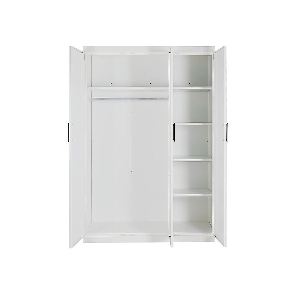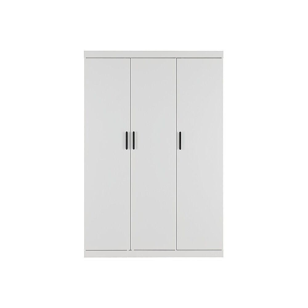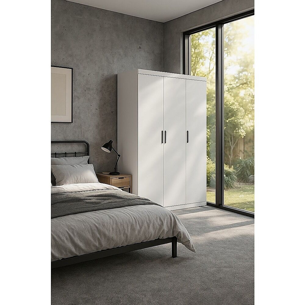 Add modern style and smart storage to your bedroom with this 3 Door Freestanding White Wardrobe. Crafted from steel plates with a sleek powder-coated surface, it's built for daily use. Stylish black metal handles provide a premium accent to its clean, contemporary design.