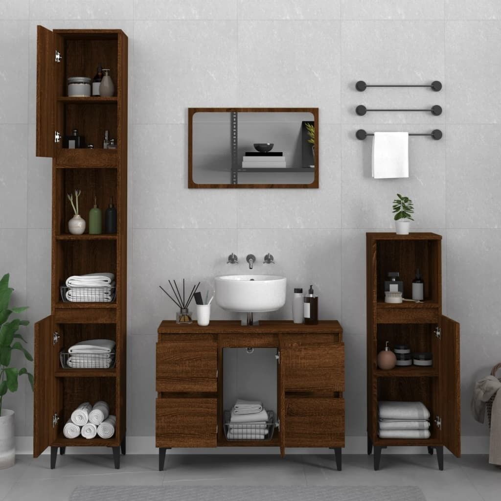 $283.49This stylish bathroom furniture set, featuring spacious storage space, is an excellent addition to your bathroom, giving it a tidy and striking appearance! Durable material: The engineered wood is of exceptional quality with a smooth surface and features strength, stability and resistance to moisture.Ample storage space: These bathroom cabinets offer ample storage space for keeping your bathroom supplies well organised.Metal feet: The metal feet add a modern and calm style to your interior while ensuring stability.Easy-to-clean surface: The bathroom unit is easy to clean with a damp cloth.Stylish design: The clean lines and sleek design blend into your bathroom perfectly. Warning:To prevent it being overturned, this product must be used with the provided wall attachment device. Good to know:Screws and plugs for inside the wall are not included. We advise to find and use screws and plugs suitable specifically for your walls. If you're not sure, you can consult with a professional. Please read and follow each step of the instructions.